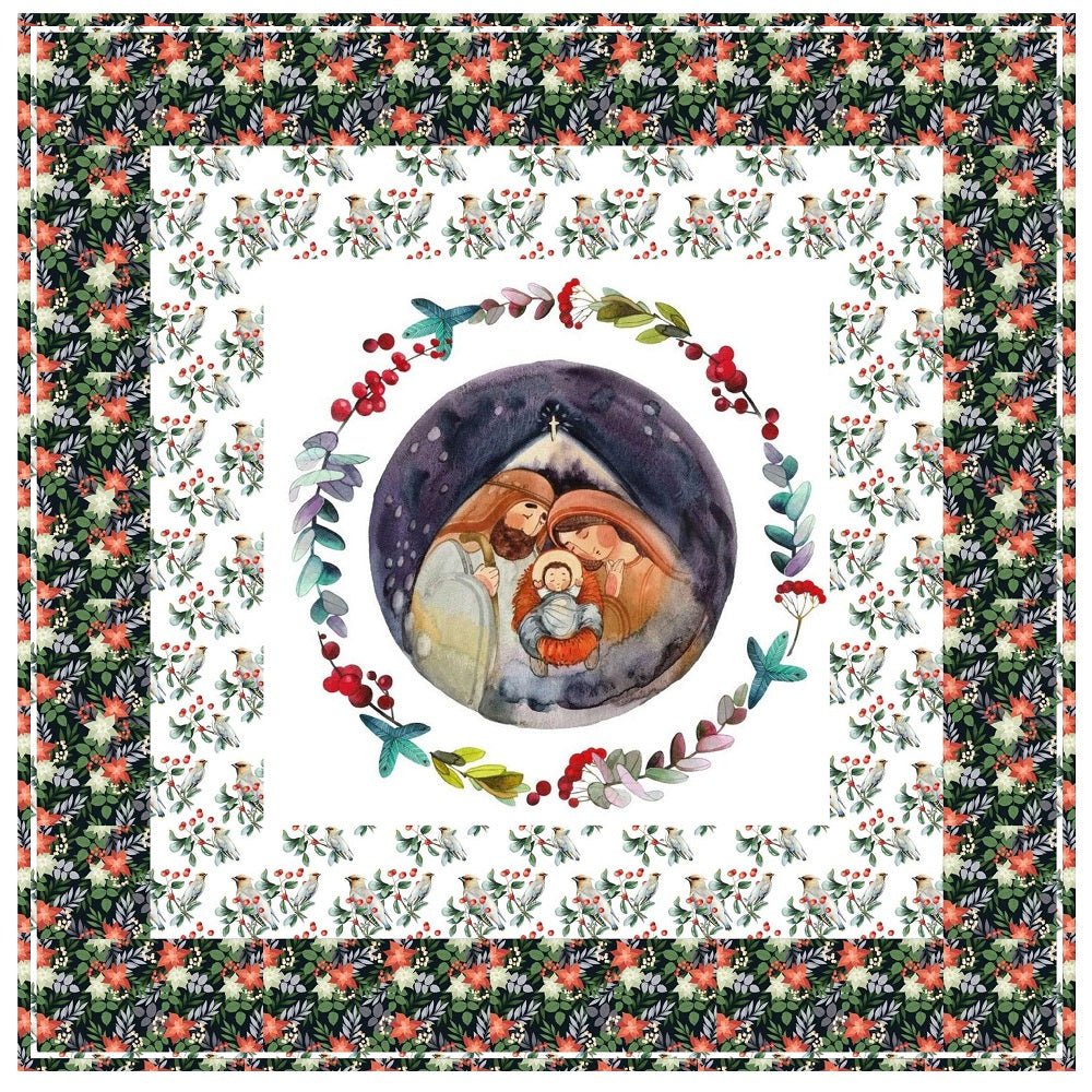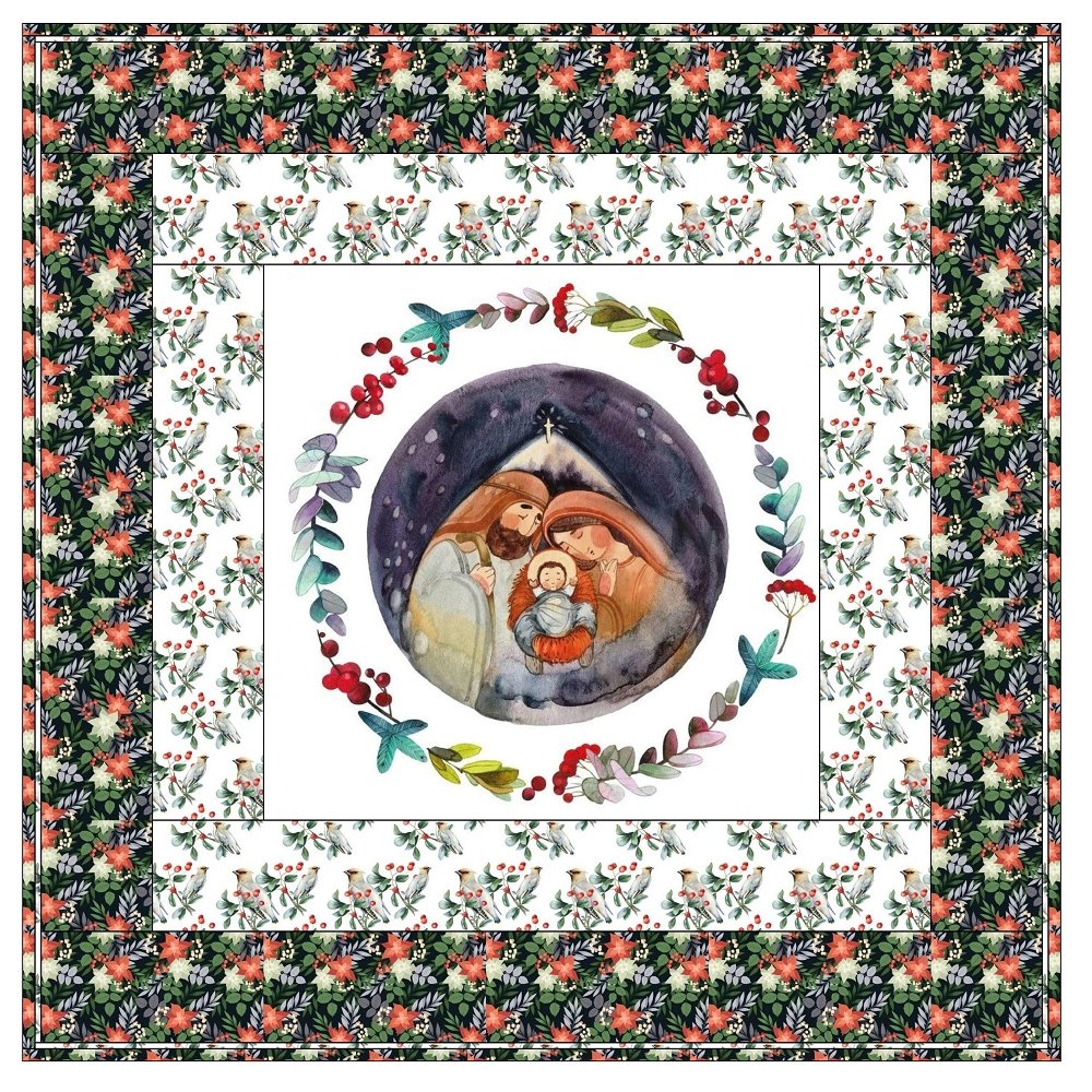 The Nativity Scene Wall Hanging includes everything that you need to make the quilt - the instructions and a total of 3 1/2 yards of fabric and a 23" panel. It has two borders and is finished with a flange binding. Batting is sold separately. The finished size of this quilt is 42" x 42".