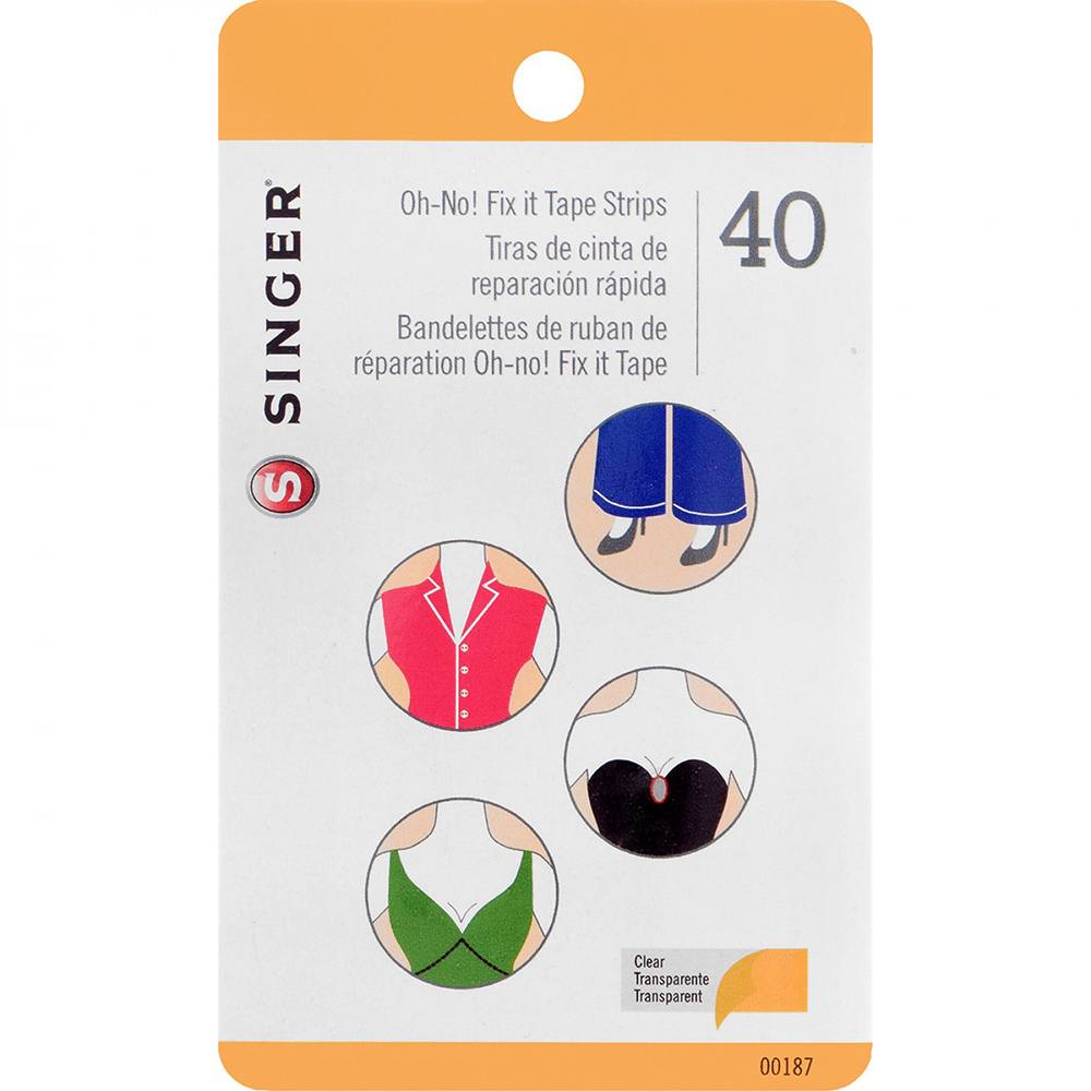 For quick temporary fixes to fabrics use Singer's Oh No! QuickFix Tape Strips. These strips can be used on high-end clothes and everyday outfits. Oh No! QuickFix Strips are a double-sided sticky tape that prevents mishaps that occur when you have low necklines, strapless shirts, or fabric gaps. The clear adhesive also serves as a temporary fix on household items, such as curtain hems and lampshade edges. Each pack of Singer's Oh No! QuickFix Tape Strips contains 40-pieces measuring 3/4" wide by 3-1/4" long.