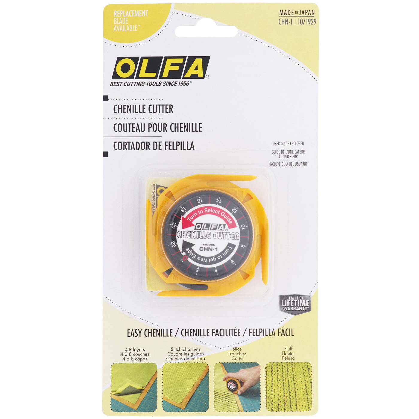 Create your own chenille fabric - easily cut multiple layers of fabric to add texture and dimension to any project! Features 4 channel guide sizes for narrow to wide widths (1/8", 1/4", 3/8" & 1/2"). Long lasting, ultra sharp, double honed edge blade made from high quality tungsten carbide tool steel.