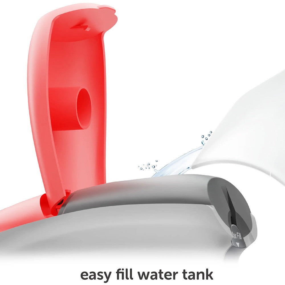 Each M3Pro Mini Iron holds 50ml (1.7 fl oz) of water in its easy-view tank. With the large tank, you can take advantage of the dual-zone steam bursts. Independent front and rear steam zones allow for maximum pressing power and wrinkle removal. The M3Pro is meant to be used with regular tap water unless your water has over 12 grams of hardness; then use either bottled water or mix half tap water with half distilled water.