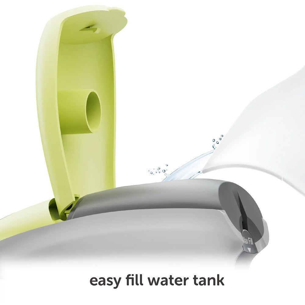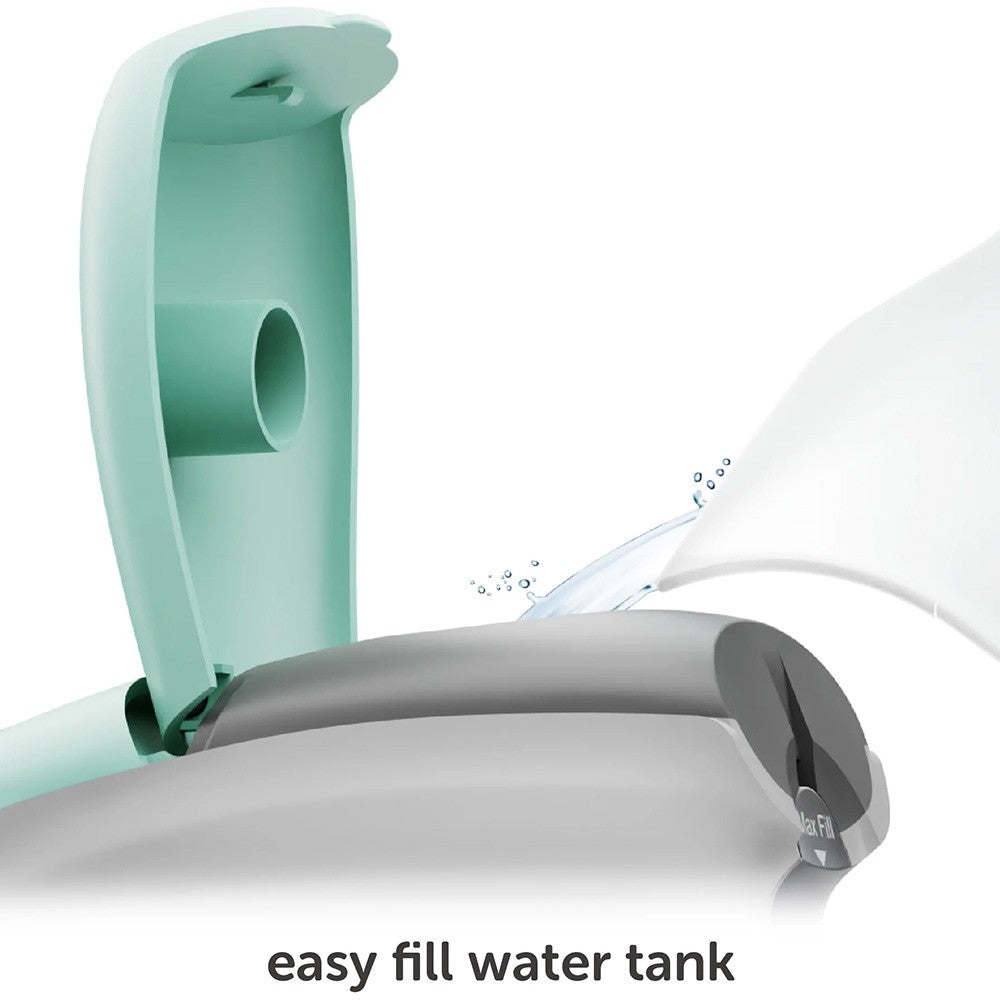 Each M3Pro Mini Iron holds 50ml (1.7 fl oz) of water in its easy-view tank. With the large tank, you can take advantage of the dual-zone steam bursts. Independent front and rear steam zones allow for maximum pressing power and wrinkle removal. The M3Pro is meant to be used with regular tap water unless your water has over 12 grams of hardness; then use either bottled water or mix half tap water with half distilled water.