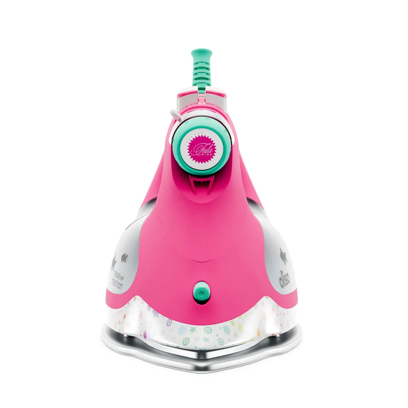 The Oliso Tula Pink Iron has an easy-to-use fabric selector dial that adjusts the temperature according to the fabric being ironed using three settings: low, medium, or high. Use higher temperatures on cotton, medium on wool, and lower temps for synthetic blends. When you are not using your iron, the temperature must be set to medium or low in the resting position. It features a 30-minute extended auto-shut-off for sewers and quilters and a 30-second safety auto shut-off if tipped over.