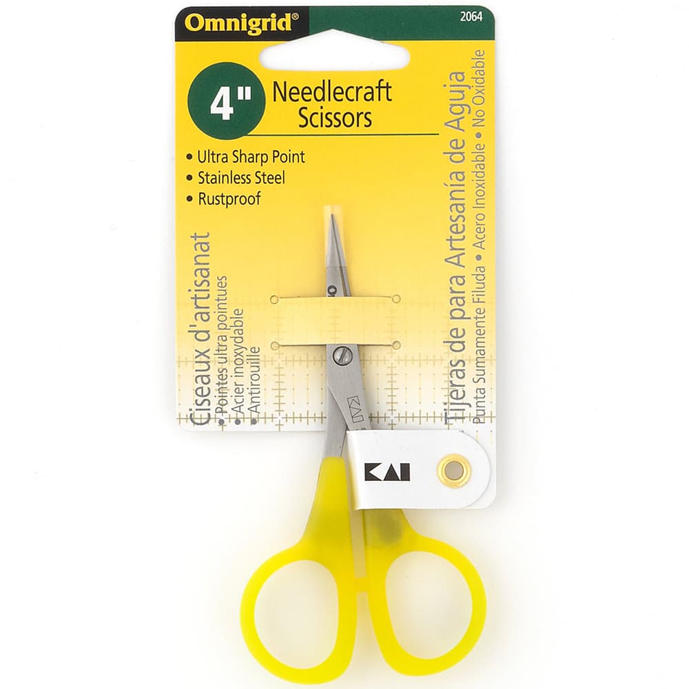 Omnigrid's 4" stainless steel needlecraft scissors have extremely sharp blades and ultra-sharp points, making them ideal for many hand sewing applications, including snipping applique (cuts to the single thread), embroidery, needlework, and cross-stitch. The blades are made of stainless steel and rustproof. For protection and storage, a transparent plastic safety tip is also included.
