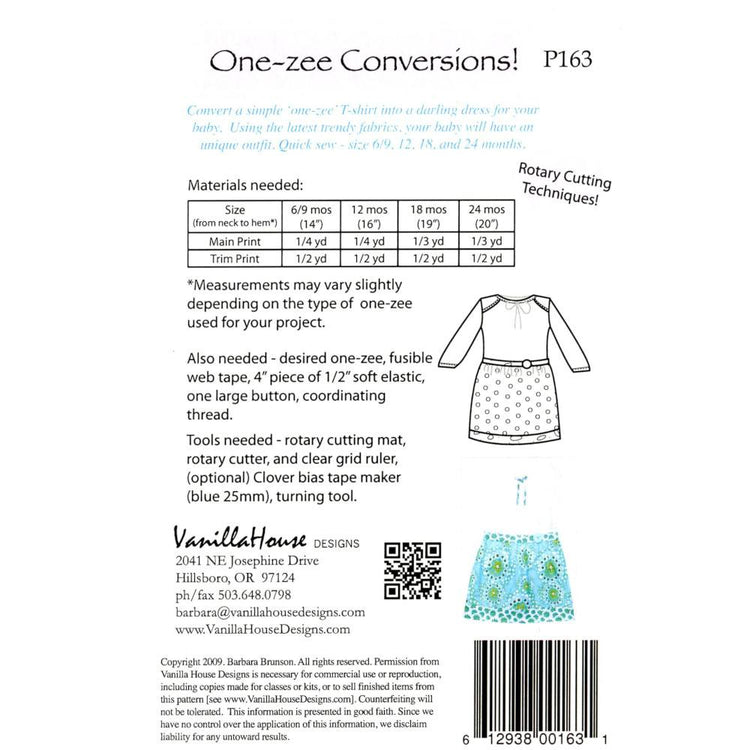 With the One-Zee Conversions Pattern, you can turn a standard onesie into an adorable little dress. Choose your favorite fabrics to create unique dresses with contrasting waistbands and hems. Add embellishments in the form of buttons and bows! The One-Zee Conversions Pattern includes instructions for children 6-24 months of age.