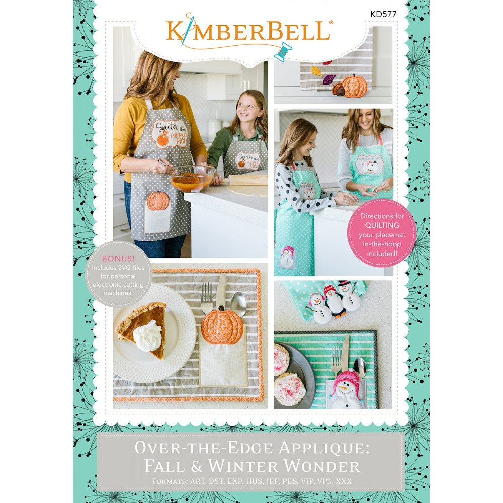 KimberBell's Over the Edge Applique CD features Fall and Winter designs that are perfect for aprons, hand towels, and placemats. Applique designs include pumpkins, pies, and snowmen. Incorporate fun textures into each design like fringe, applique glitter sheets, and trim. Compatible embroidery file formats include ART, DST, EXP, HUS, JEF, PES, VIP VP3, XXX, and an SVG format for electronic shape cutting machines. The included instructions also take you through the process of machine quilting your placemats.