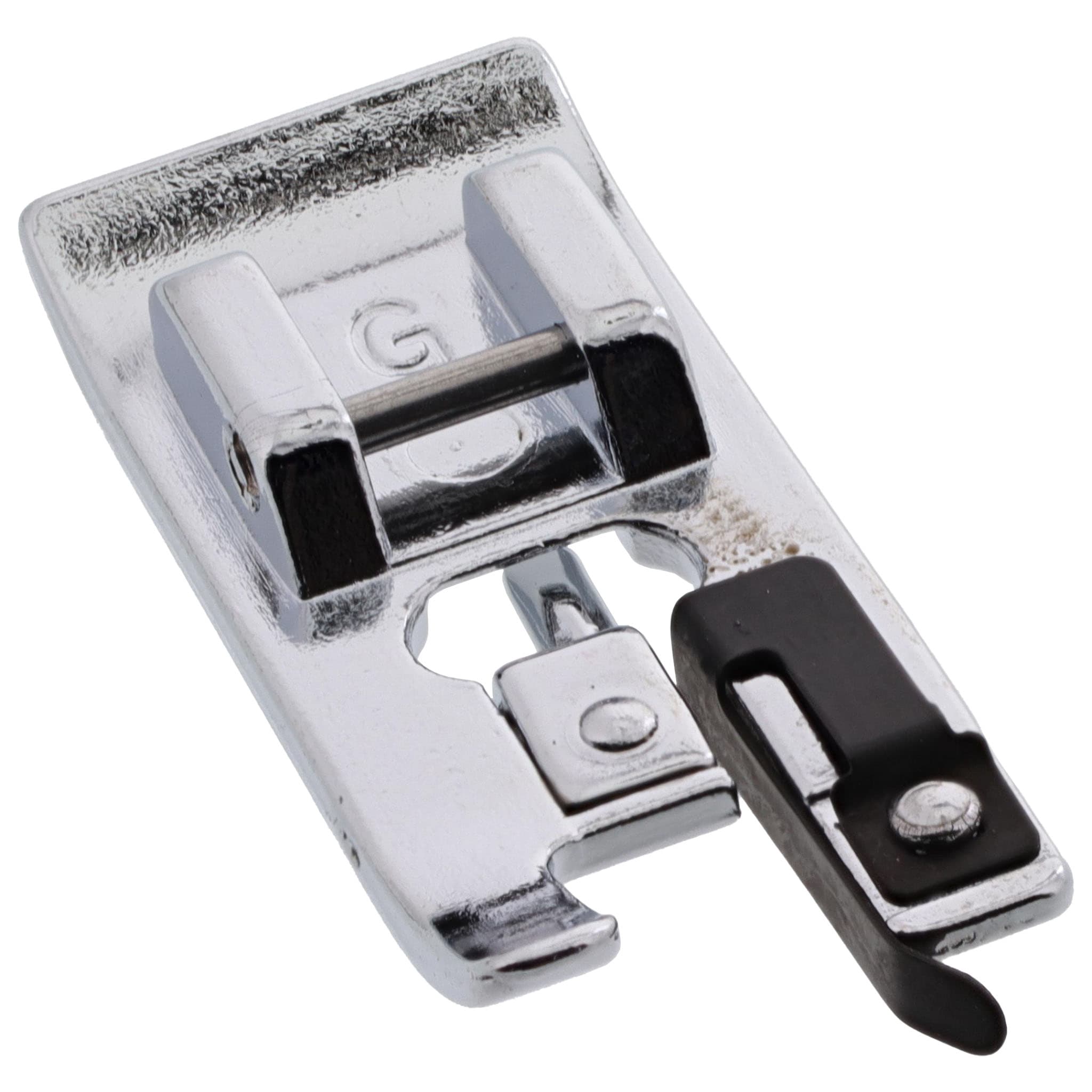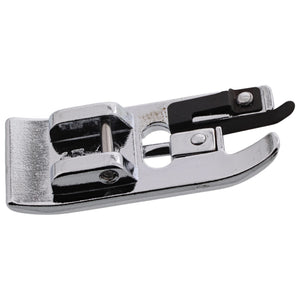 The Overlock Foot allows you to finish your unraveling fabric edges. This foot finishes any edge with a nice and clean zigzag stitch, a time-honored method. It can help regulate the thread tension, allowing the stitch to lie flat. Lastly, this foot is to be used with medium-weight fabrics.