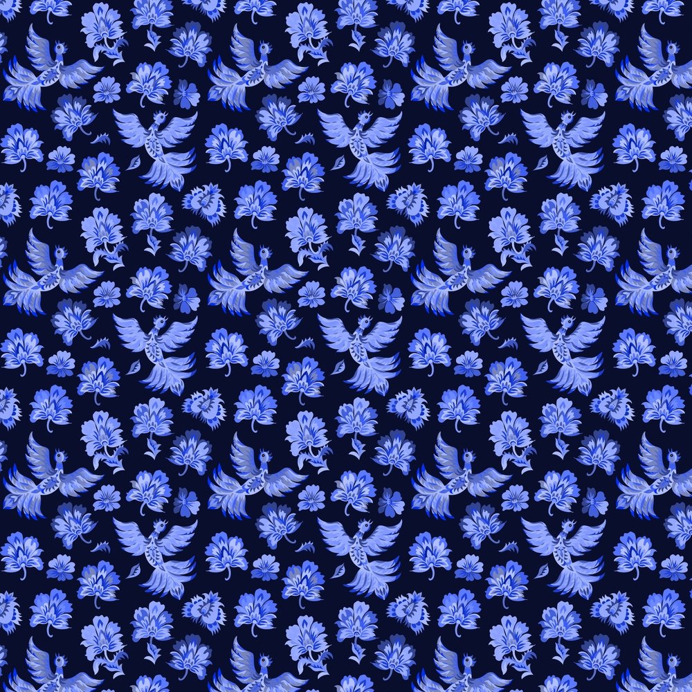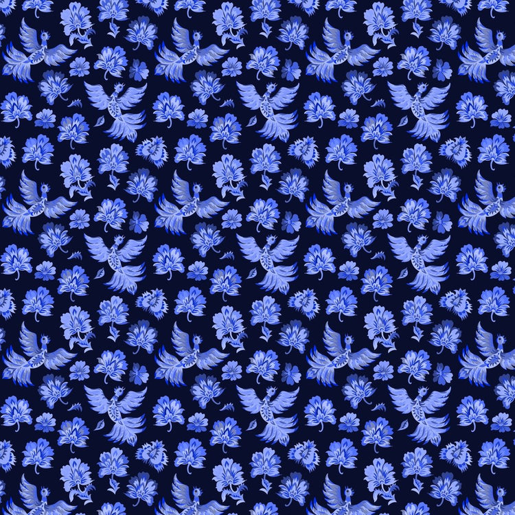 The Blue and Navy Packed Ukrainian Fantasy Birds & Flowers Fabric is part of the Ukrainian Folk Painting Fabric Collection printed by Sew Creative Fabrics. Digitally Printed on 100% cotton.