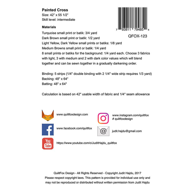 Designed by Judit Hajdu, the Painted Cross Pattern is a carefully pieced, patchwork design using batiks. This stunning wall hanging features a cross in dark colors with a lighter gradient surrounding it and another border verging back into darker shades. The finished Painted Cross Pattern measures 42" by 55-1/2", making it the ideal size for a quilt. Included with the pattern, you receive step-by-step instructions, detailed images, a recommended materials list, yardage calculations, cutting instructions, and a quilt assembly guide.
