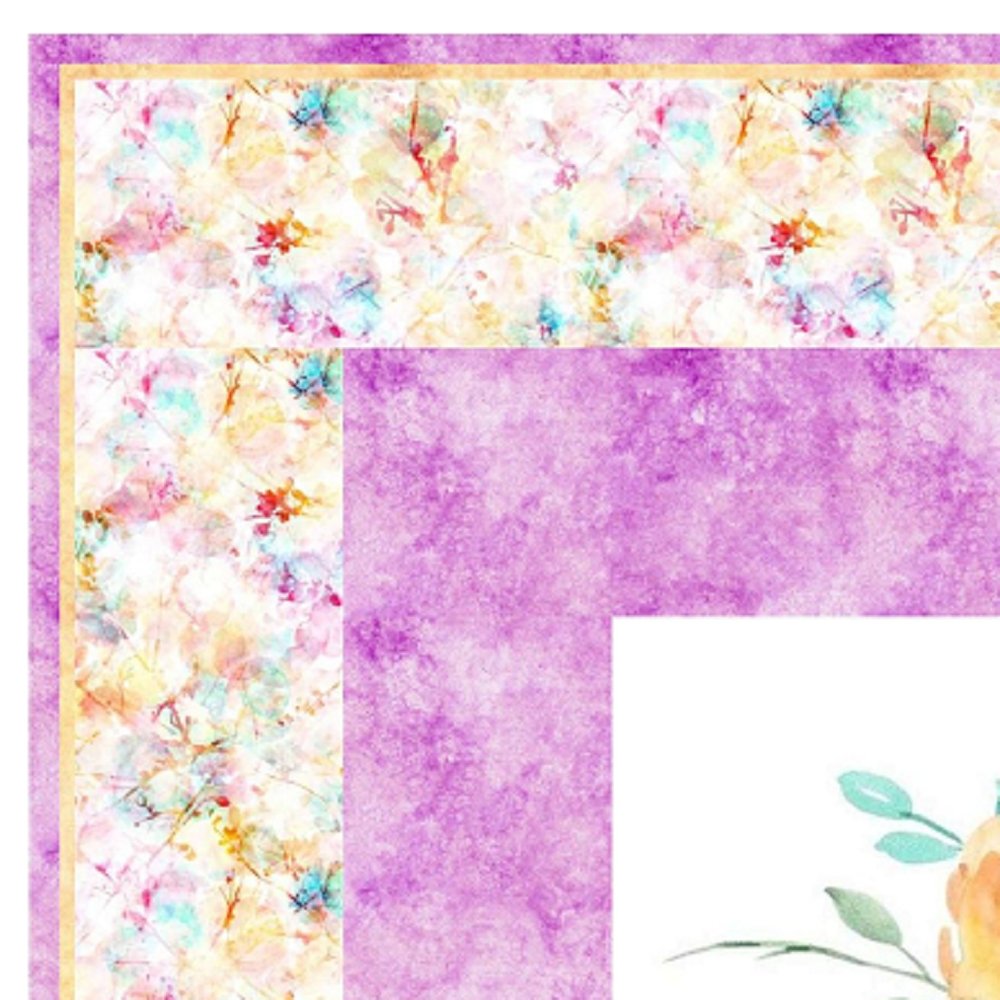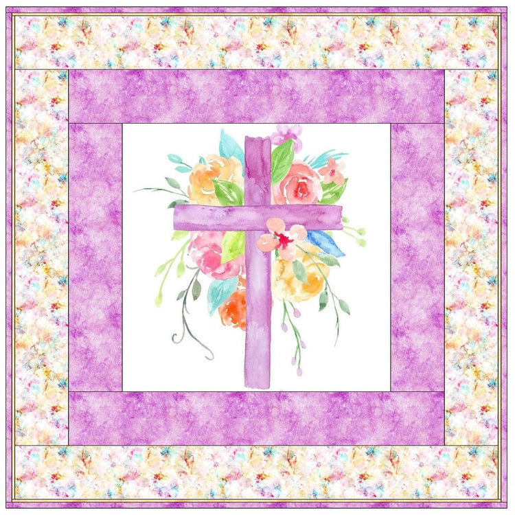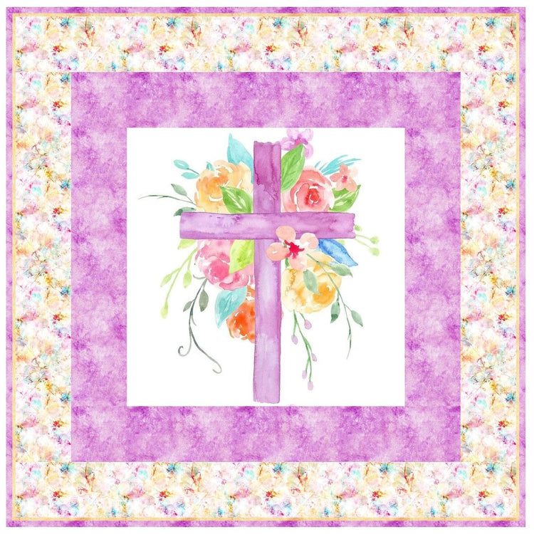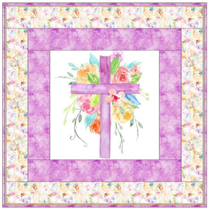 The Pastel Watercolor Floral Cross Wall Hanging includes everything that you need to make the quilt - the instructions and a total of 3 1/2 yards of fabric and a 23" panel. It has two borders and is finished with a flange binding. Batting is sold separately. The finished size of this quilt is 42" x 42".