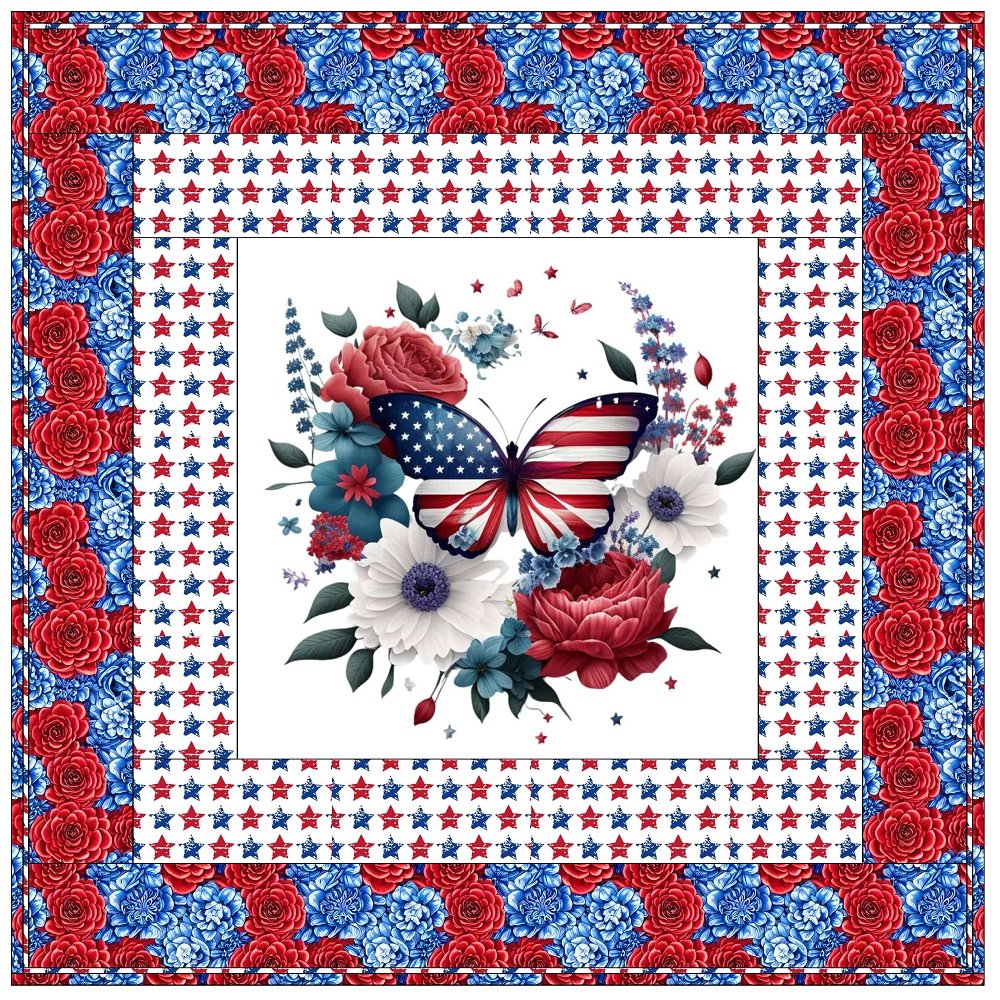 The Patriotic Butterfly 1 & Packed Flowers Wall Hanging includes everything that you need to make the quilt - the instructions and a total of 3 1/2 yards of fabric and a 23" panel. It has two borders and is finished with a flange binding. Batting is sold separately. The finished size of this quilt is 42" x 42".