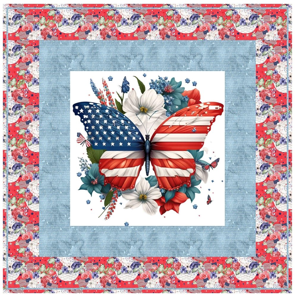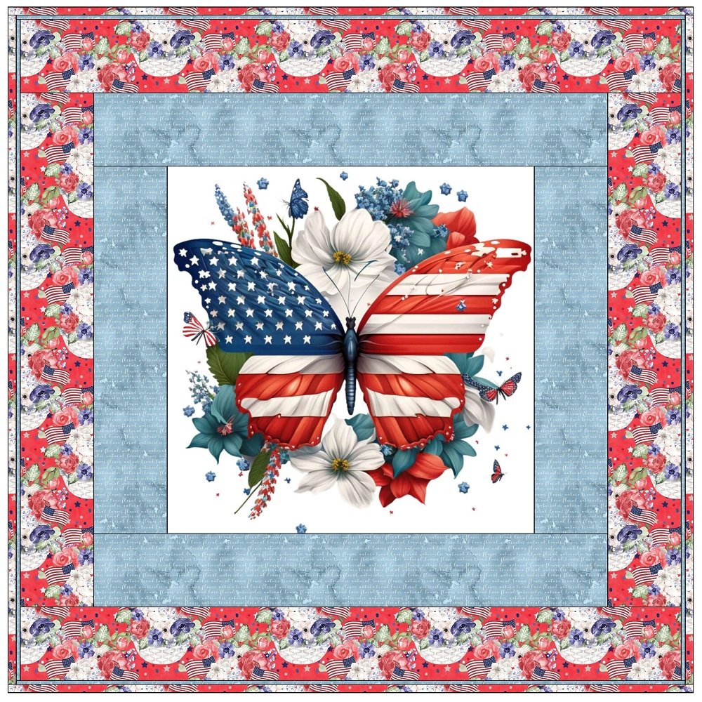 The Patriotic Floral Butterfly 5 Wall Hanging includes everything that you need to make the quilt - the instructions and a total of 3 1/2 yards of fabric and a 23" panel. It has two borders and is finished with a flange binding. Batting is sold separately. The finished size of this quilt is 42" x 42".
