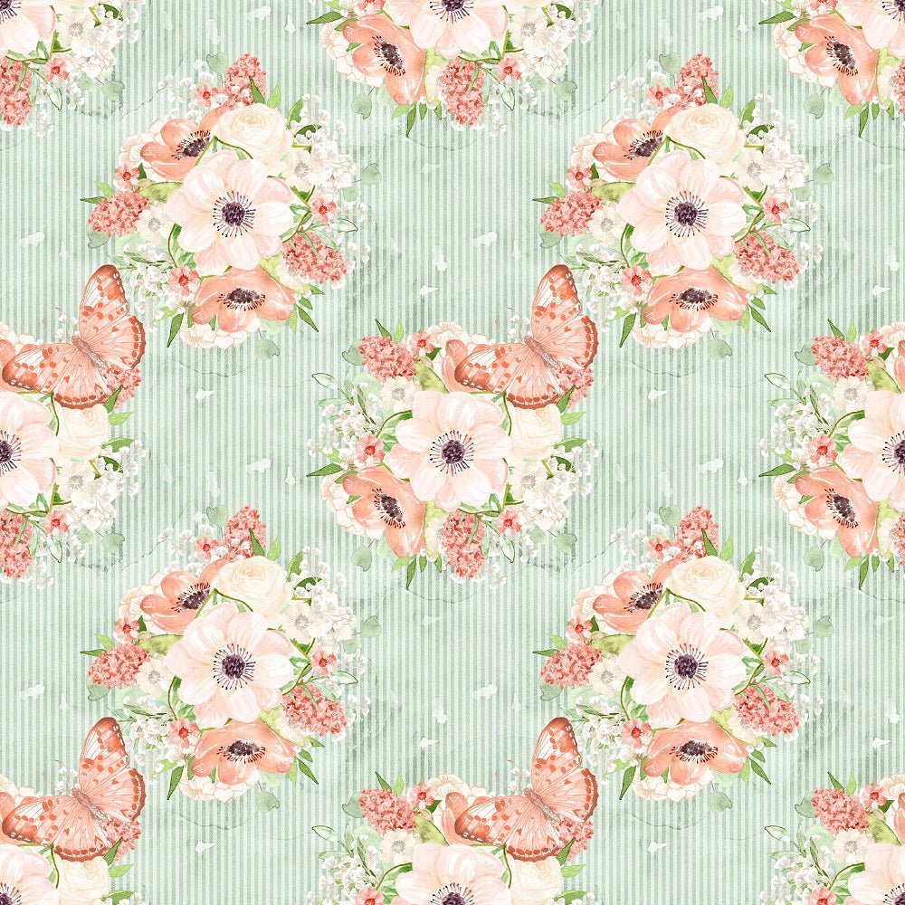 Peach Romance Flowers and Butterflies Striped Fabric - Green