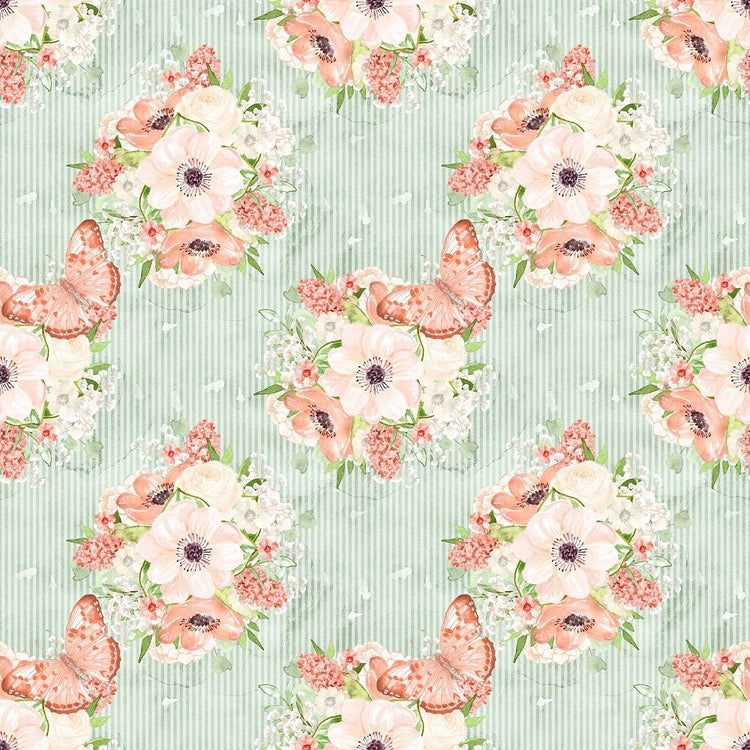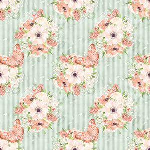 The Green Peach Romance Flowers and Butterflies Striped Fabric is part of the Peach Romance Fabric Collection printed by Sew Creative Fabrics. Digitally Printed on 100% cotton.