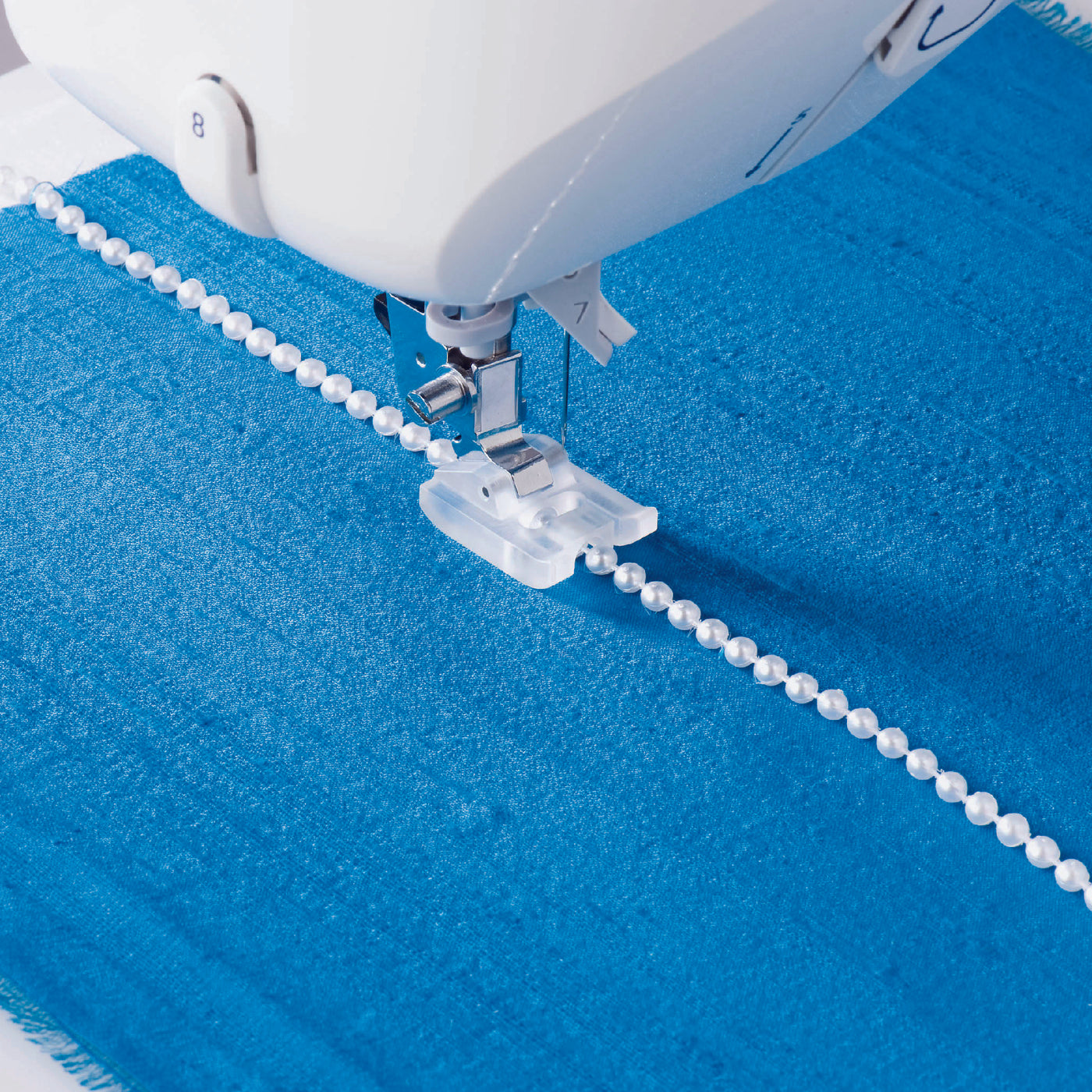 The Pearl Foot is perfect for sewing on strands of pearls or beads up to a diameter of 4mm. This foot can also be used to sew on braiding or piping cord, thick cording, and even on curves. Simply guide the strands of pearls/beads through the groove in the center of the Pearl Foot, sewing with a zig-zag stitch.