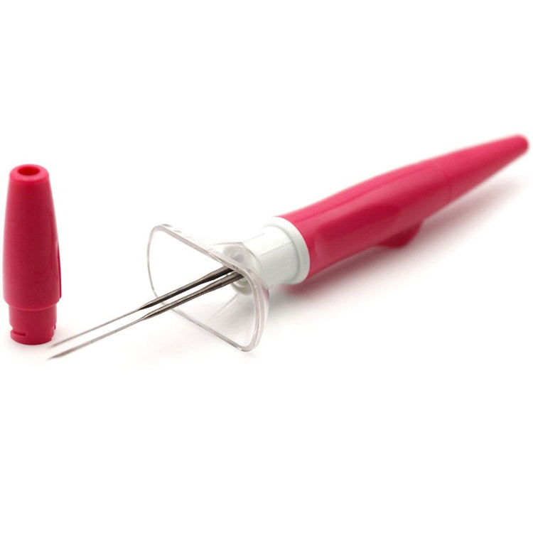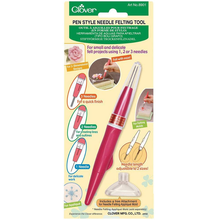 The Clover Pen Style Needle Felting Tool allows the application of small or delicate materials using one, two, or three needles. It can be adjusted to two lengths of needle sizes using the body extender. Combine the body extender with the mold attachment, and it can be used with Clover Needle Felting Applique Molds for creating three-dimensional designs and appliques. The pen-style grip action offers ease of use. Needles can be easily changed, and a cap is included for protection when not in use. Includes: Pen Style Felting Tool, Cap, Body Extender, Mold Attachment.