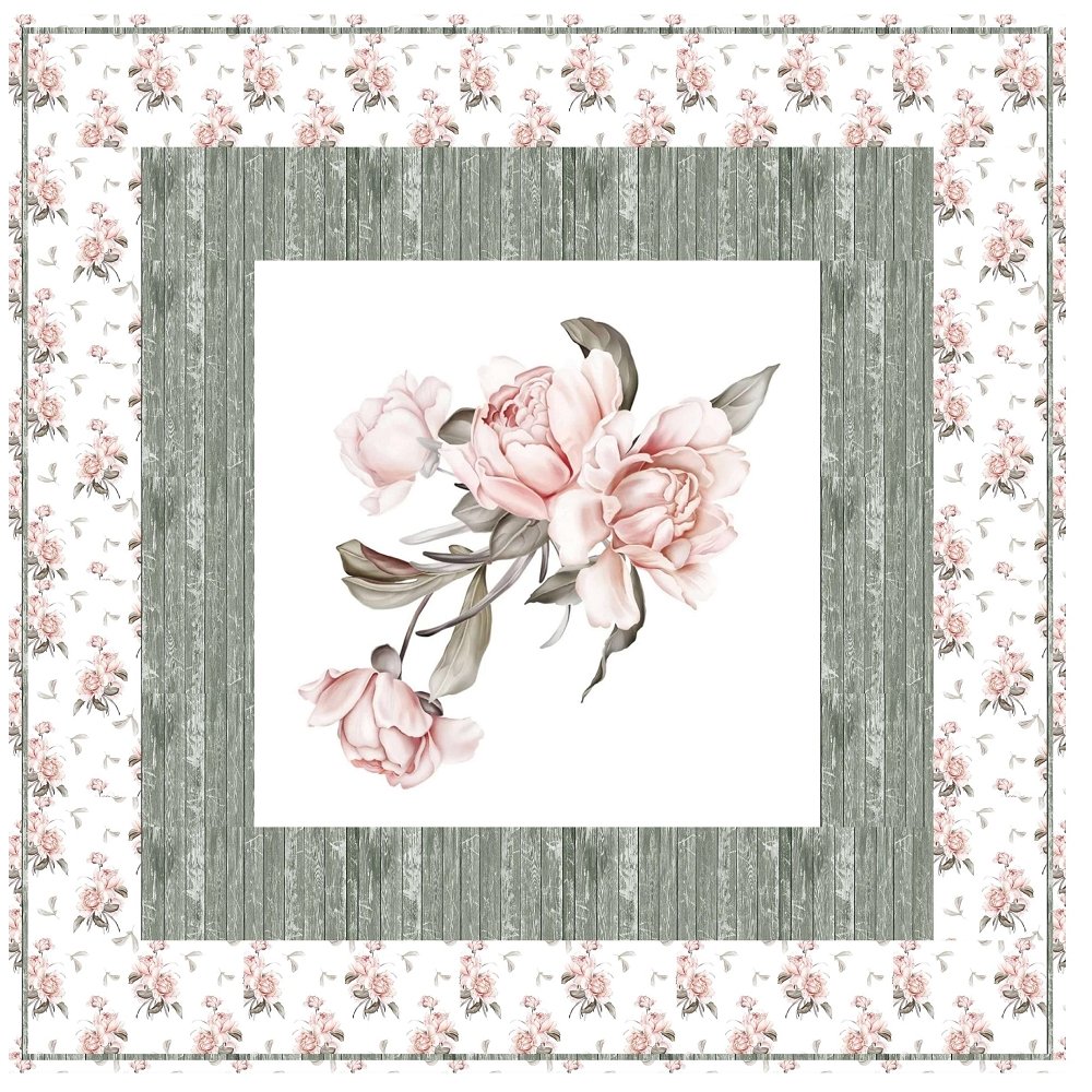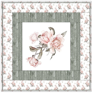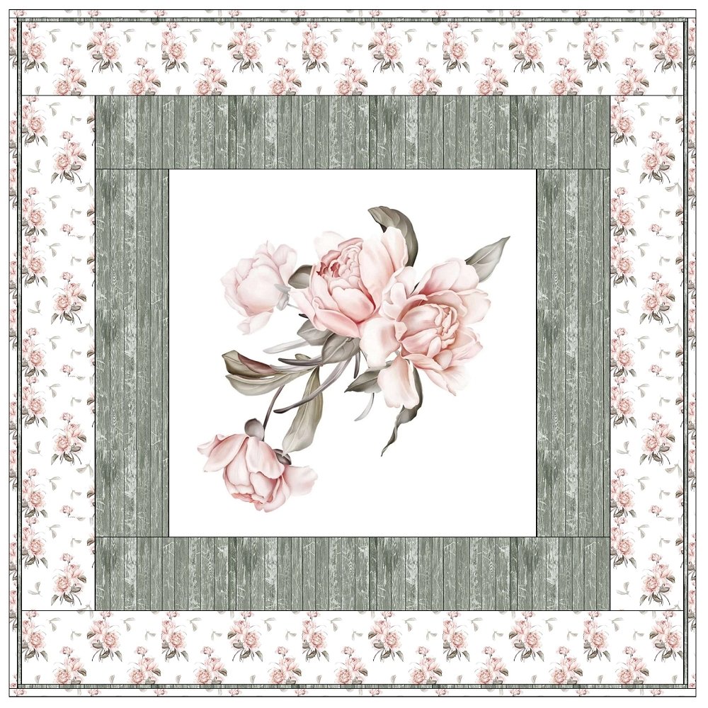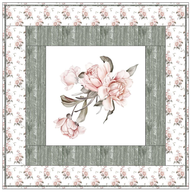 The Peony Bouquet Framed Wall Hanging includes everything that you need to make the quilt - the instructions and a total of 3 1/2 yards of fabric and a 23" panel. It has two borders and is finished with a flange binding. Batting is sold separately. The finished size of this quilt is 42" x 42".