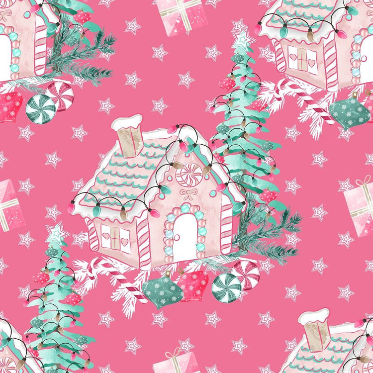 The Pink Peppermint Christmas Gingerbread House Fabric is part of the Peppermint Christmas Fabric Collection printed by Sew Creative Fabrics. Digitally Printed on 100% cotton.