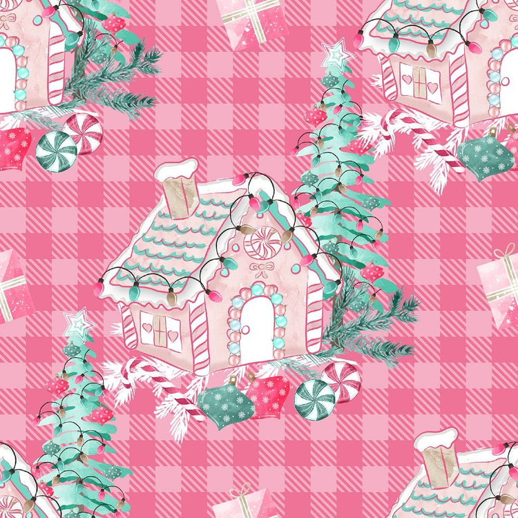 The Pink Peppermint Christmas Gingerbread House on Plaid Fabric is part of the Peppermint Christmas Fabric Collection printed by Sew Creative Fabrics. Digitally Printed on 100% cotton.