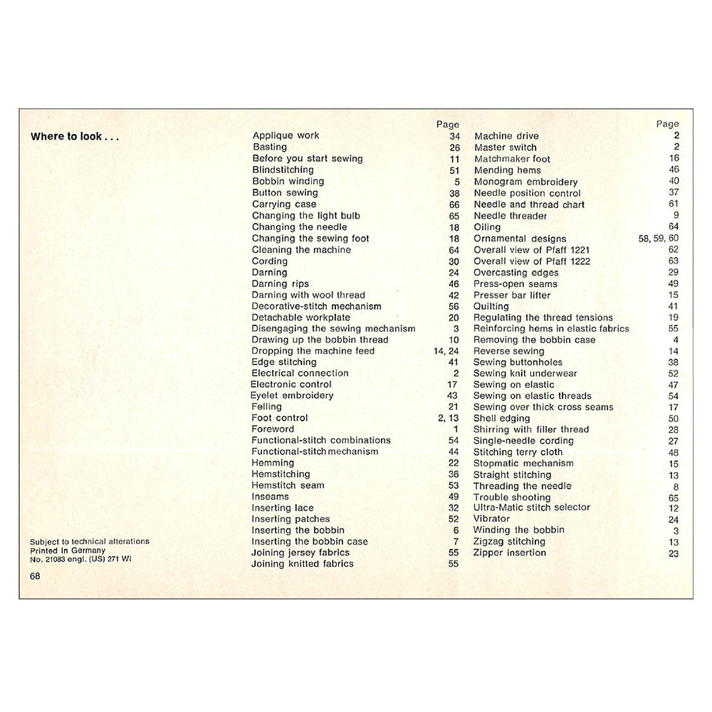 Pfaff 1222 Sewing Machine Instruction Manual (Model 1222/1221) - 71 Pages. Lost your sewing machine's manual? We've got you covered! This instruction manual is the ultimate guide to unlock the full potential of your Pfaff 1222. No more confusion or frustration—just clear, concise instructions right at your fingertips. What's inside? Everything you need to know from setting up to mastering your sewing machine and all its features.