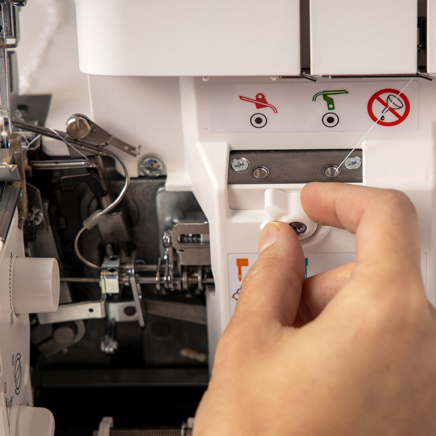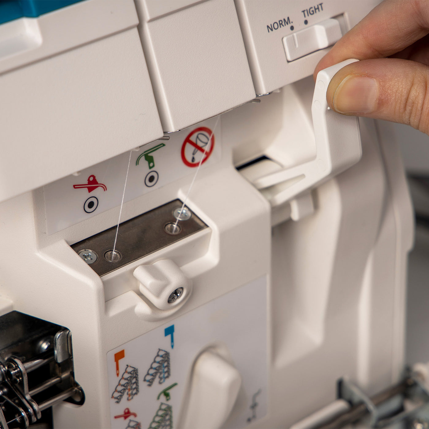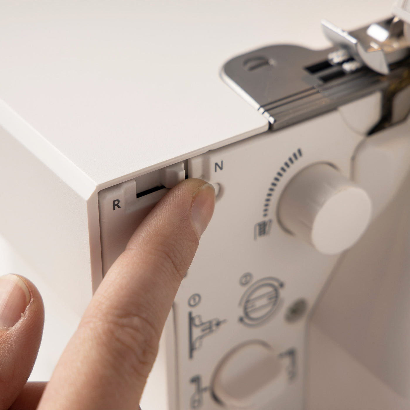 The Stitch Finger Activation Switch provides enhanced control and versatility for achieving flawless stitches on various fabrics. This feature allows you to easily engage or disengage the stitch finger, adjusting the stitch formation to suit your desired finish. It's perfect for creating rolled hems, narrow edges, or decorative stitches with precision and ease. By adapting to the specific needs of your project, the stitch finger activation ensures clean, professional-quality results, whether you're working with lightweight materials or heavier fabrics. This level of customization makes every sewing task more efficient and satisfying.