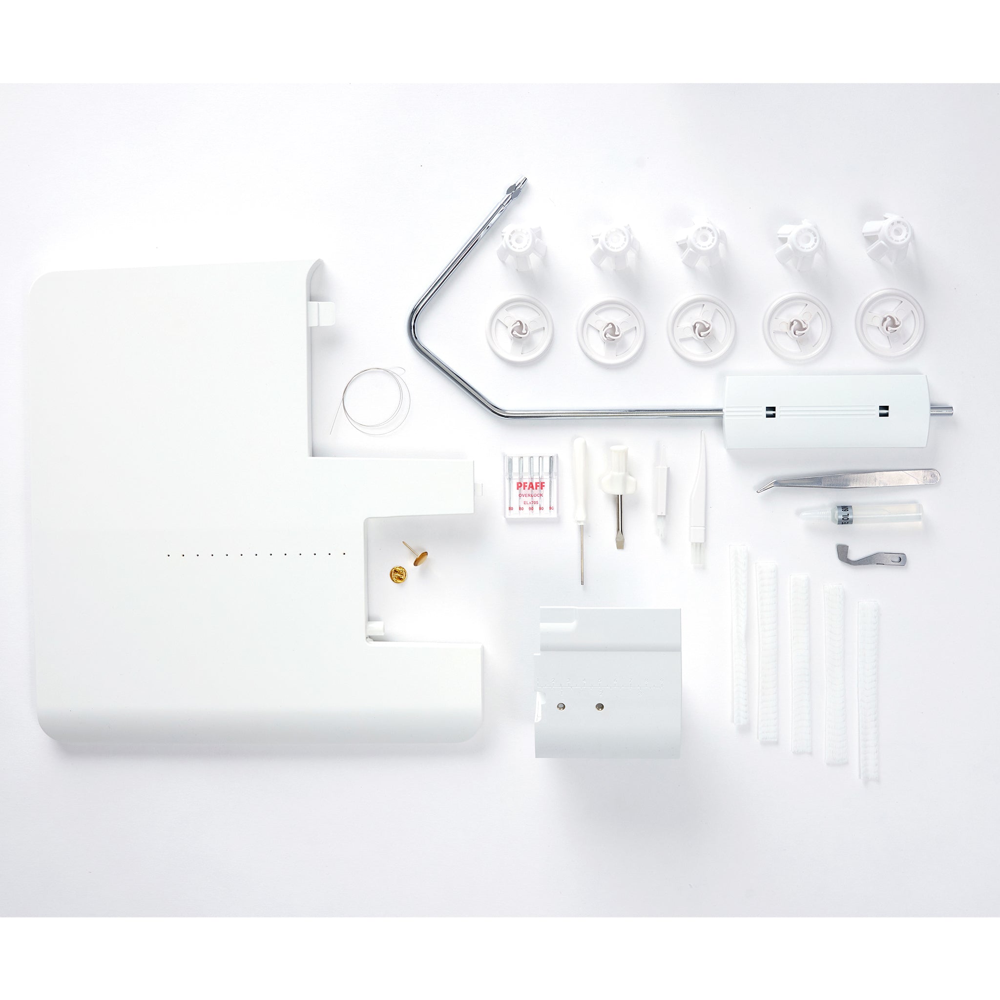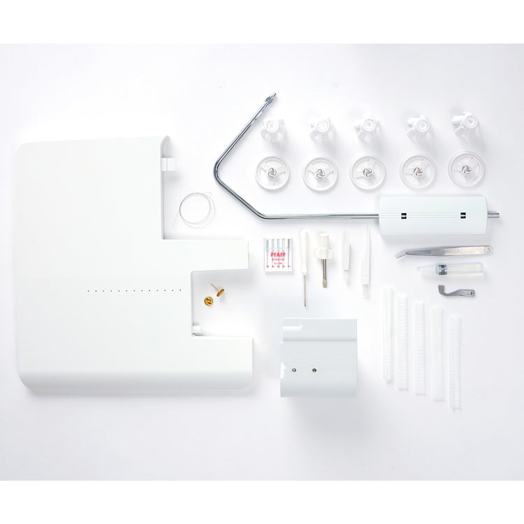 Universal Standard Presser Foot, Needles, 5 Spool Holders, 5 Spool Caps, 5 Thread Nets, Tweezers, Needle Threader, Allen Key, Screwdriver, Brush, Sewing Machine Oil, Knife Blade for Upper Cutter, Coverstitch Table B, Knee Lifter, Accessory Box, Threading Wire, Foot Control, Pivot Pin, Power Cord, Waste Tray, Soft Dust Cover, Extension Table, and User's Guide.