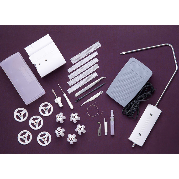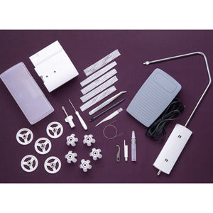 Universal Standard Presser Foot, Needles, 5 Spool Holders, 5 Spool Caps, 5 Thread Nets, Tweezers, Needle Threader, Allen Key, Screwdriver, Brush, Sewing Machine Oil, Knife Blade for Upper Cutter, Stylus, Coverstitch Table B, Knee Lifter, Accessory Box, Threading Wire, Foot Control, Power Cord, Waste Tray, Soft Dust Cover, Extension Table, and User's Guide.