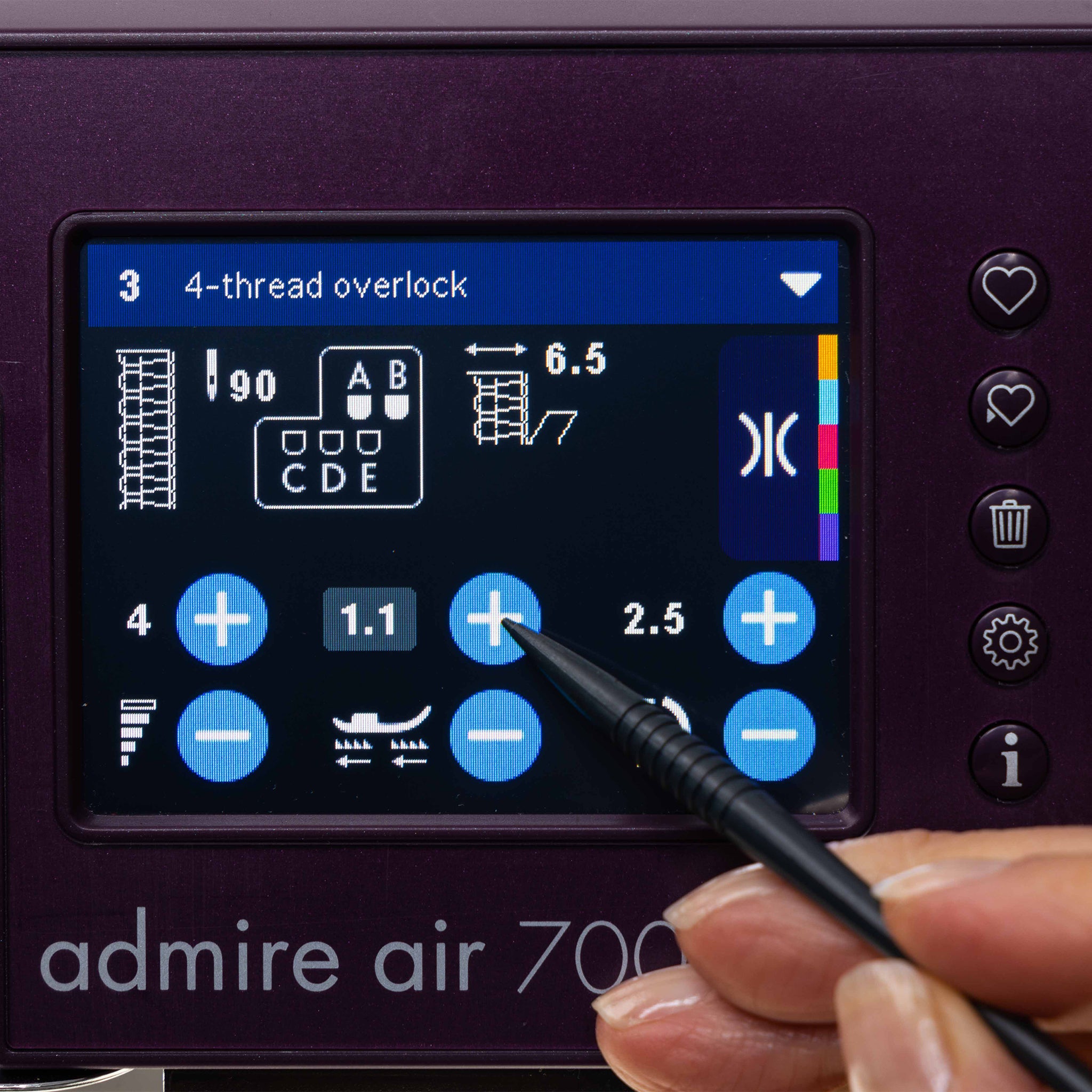The Admire Air 7000 offers an impressive array of 26 built-in stitches, providing the versatility you need to handle any project with precision and style. From utility stitches for durable seams to decorative stitches that add flair to your designs, this machine has you covered. Its stitch options include a variety of overlock, coverstitch, chainstitch, flatlock, and rolled hem stitches, making it perfect for everything from garment construction to intricate finishing touches. Whether you're working with stretch fabrics, lightweight materials, or thick layers, the Admire Air 7000 delivers consistent, high-quality results. The built-in stitches are easily accessible via the intuitive color touchscreen, allowing you to select, adjust, and customize your stitches effortlessly.