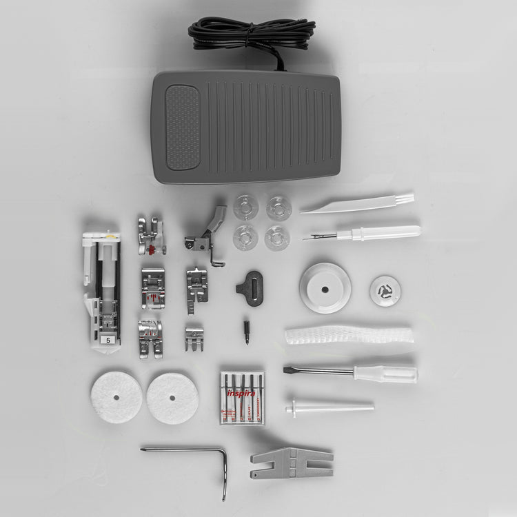 One of the things that makes the 640 Anniversary Edition so special is the bonus accessories that come with it. This exclusive kit includes 5 bonus feet: IDT Narrow Edge Foot, Invisible Zipper Foot, Piping Foot, IDT Couching/Braiding Foot, IDT Open Top Applique Foot. The standard accessories for the 640 include the: IDT Standard Presser foot, IDT Fancy Stitch Foot, Fancy Stitch Foot, IDT Blindhem Foot, Zipper Foot, Buttonhole Foot, Manual Buttonhole Foot, Embroidery/Free-Motion Foot, 240x150 Creative Master Hoop, Thread Net, Edge Guide, Felt Disc (2), Screwdriver, Auxiliary Spool Pin, Seam Ripper, Lint Brush, Bobbins (5), Small Spool Cap, Large Spool Cap, 4GB USB Drive, Multi-purpose Tool, Long Needle Clamp Screw, Foot Control, Power Cord, Needles, Machine Cover.