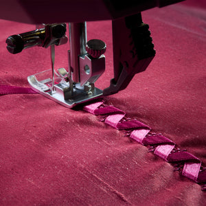 Elevate your sewing projects with a collection of unique and advanced stitch techniques designed to bring your creative visions to life. The 715 introduces Floating Stitches, a revolutionary way to add dimension and texture to your designs without thread connections between stitch points. Radiant Stitches create stunning, multi-directional patterns that radiate outward, perfect for eye-catching embellishments. Single, Double, and Triple Ribbon Stitches offer versatility and style, providing elegant, ribbon-like effects to enhance your garments and décor. Lace Edge Stitches add delicate, decorative borders that mimic intricate lacework, while Stacking Stitches allow you to layer complementary patterns for a dynamic, multi-dimensional look.