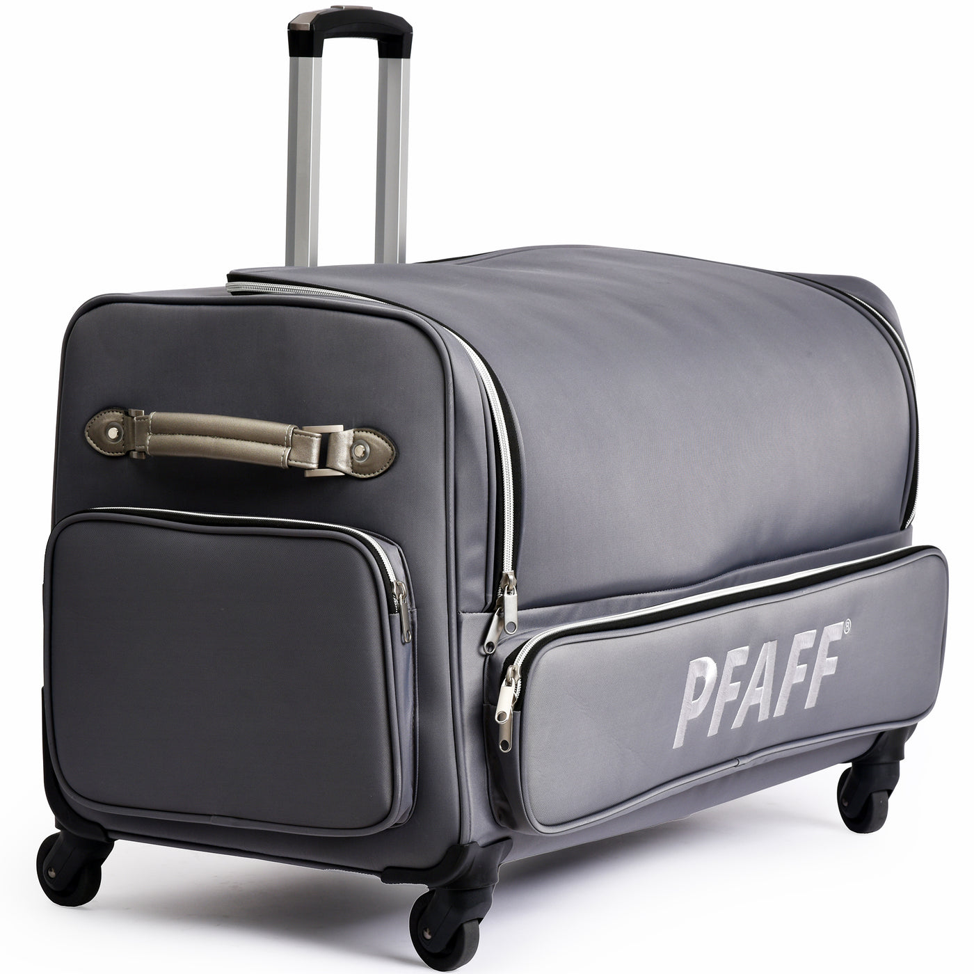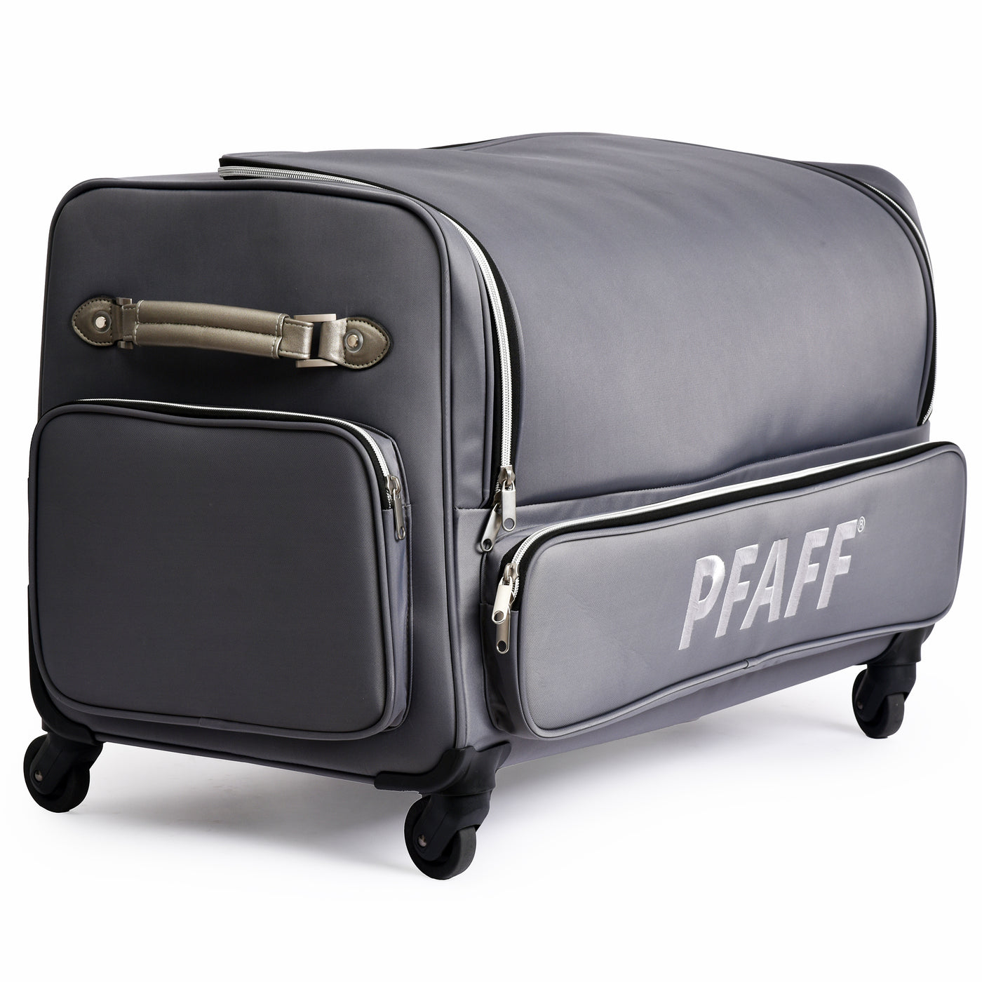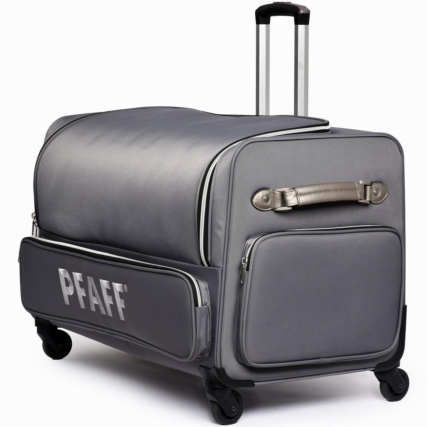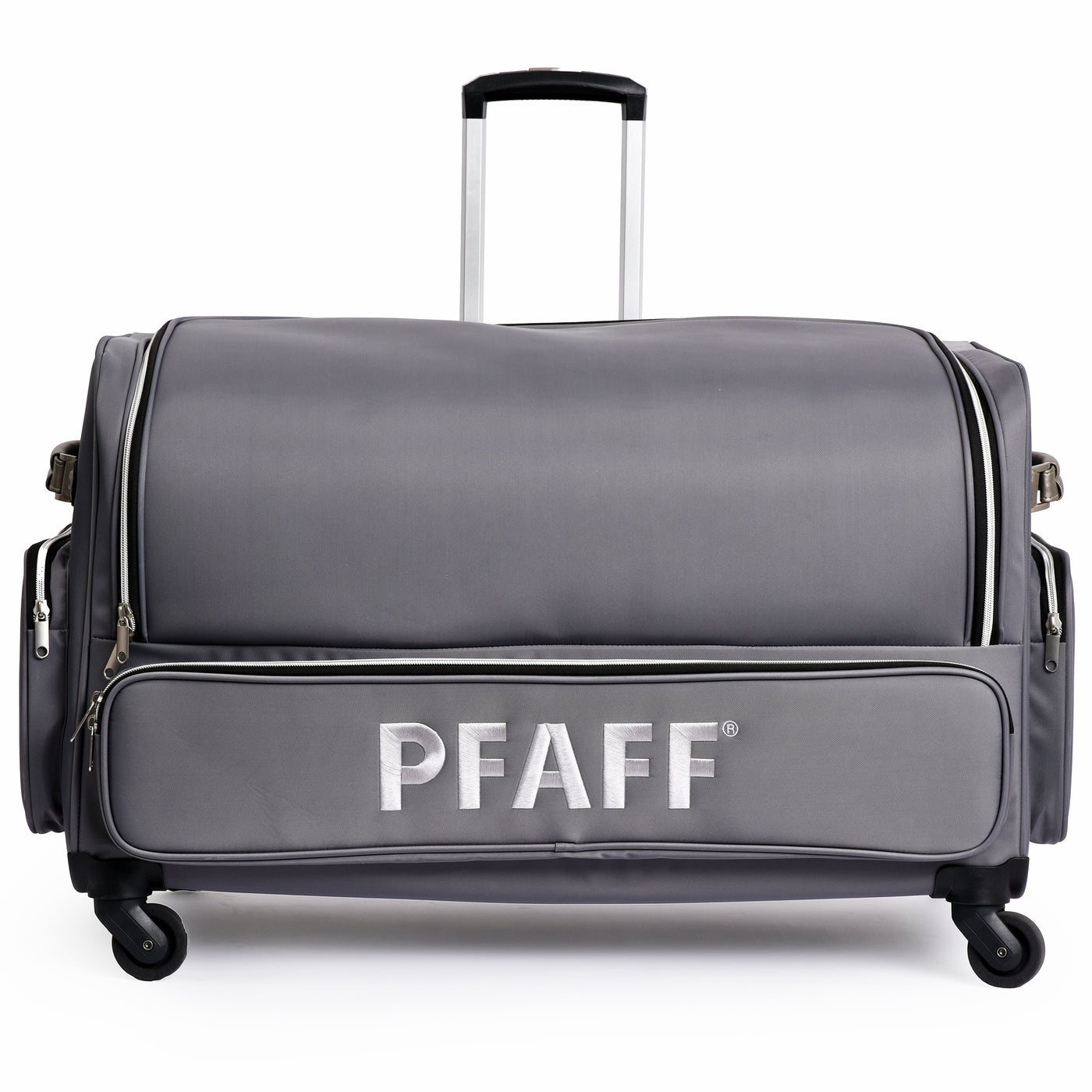 The PFAFF® Large Universal Machine Roller Bag offers a stylish and secure way to transport your machine and accessories. Its padded interior protects your equipment from dust and damage, while four smooth-gliding 360° casters and a telescoping handle make travel effortless. Thoughtfully designed with convenient storage both inside and out, this elegant bag is as functional as it is fashionable. Measuring 30" x 16" x 20", it’s finished in a cool grey polyester twill exterior that’s both durable and modern—perfect for sewists on the go.