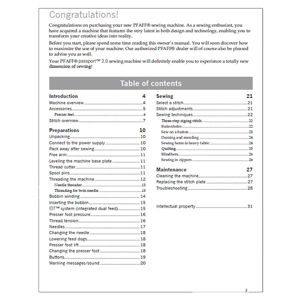 Pfaff Passport 2.0 Sewing Machine Instruction Manual (Model Passport 2.0) - 32 Pages. Lost your sewing machine's manual? We've got you covered! This instruction manual is the ultimate guide to unlock the full potential of your Pfaff Passport 2.0. No more confusion or frustration—just clear, concise instructions right at your fingertips. What's inside? Everything you need to know from setting up to mastering your sewing machine and all its features.