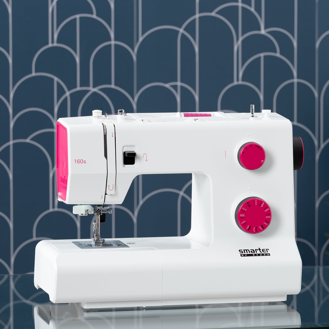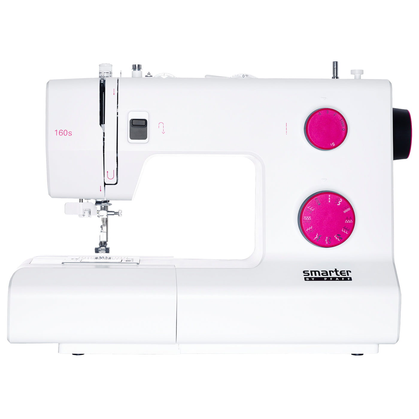 The Pfaff Smarter 160S Sewing Machine is a stylish, versatile, and reliable tool designed to make sewing easy and enjoyable for sewists of all levels. Featuring 23 built-in stitches, including utility, decorative, and stretch options, this machine is perfect for a wide range of projects, from garment construction to home décor and creative embellishments. The easy-to-use stitch selection dial allows you to switch between stitches seamlessly, while adjustable stitch length and width provide complete customization for every project. The one-step buttonhole feature takes the guesswork out of creating buttonholes, delivering perfectly consistent results with just one simple step. The built-in needle threader saves time and effort by threading the needle quickly and effortlessly, ideal for reducing setup time and focusing on creativity. The free arm design makes it easy to sew cuffs, sleeves, and other cylindrical or hard-to-reach areas, adding to the machine's versatility.