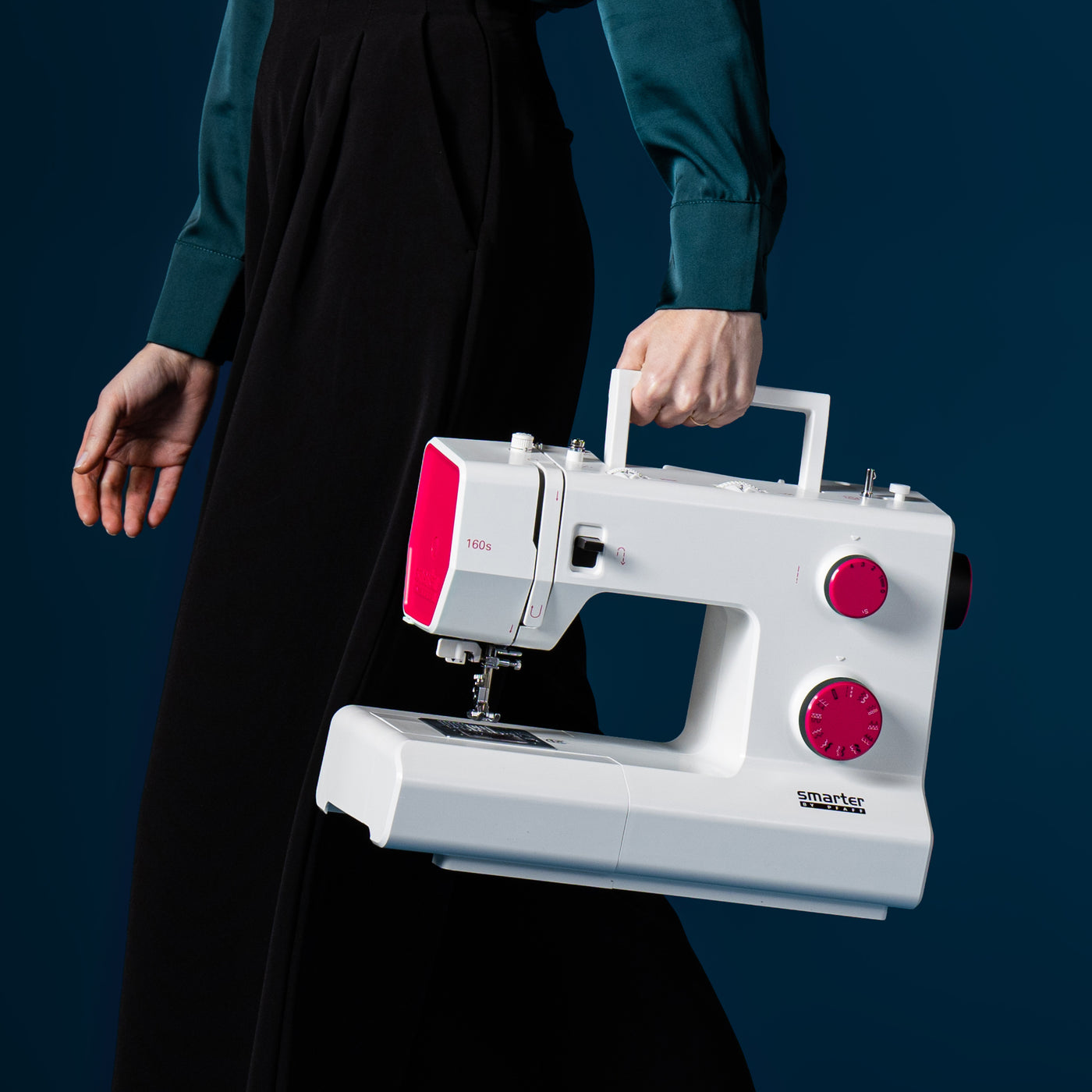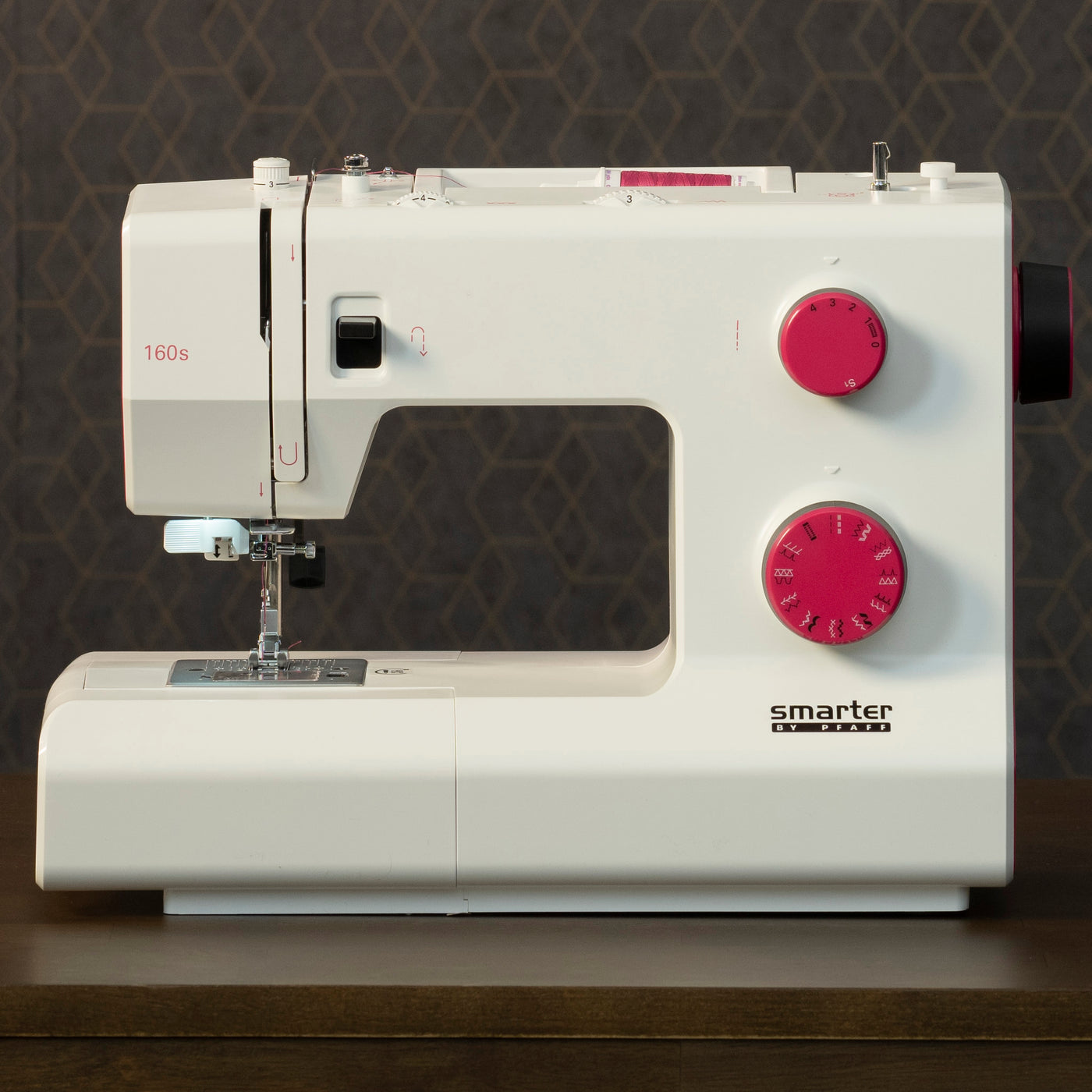 Additional convenience features include snap-on presser feet for quick changes, a built-in thread cutter for efficiency, and bright LED lighting to illuminate your workspace and enhance visibility for intricate details or darker fabrics. The top-loading bobbin system with a clear cover allows for easy monitoring and quick re-threading, keeping your sewing process smooth and uninterrupted. With its sleek, modern design and sturdy construction, the Pfaff Smarter 160S is built for durability and precision. Compact yet powerful, this machine is perfect for everyday sewing, creative projects, or on-the-go sewists. Whether you're a beginner looking for a user-friendly machine or an experienced sewist seeking a reliable partner, the Smarter 160S is equipped with everything you need to bring your ideas to life.