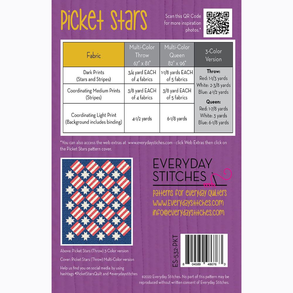 The Picket Stars Quilt Pattern teaches several techniques, including half-square triangles, chain piecing, and setting blocks on point. It makes a remarkable quilt of valor created in red, white, and blue! The Picket Stars Quilt Pattern includes detailed instructions to create a 67" by 81" (multi-color) throw, an 82" by 96" (multi-color) queen-sized quilt, and 3-color versions in a throw-sized and queen-sized quilt with a suggested list of materials for each.