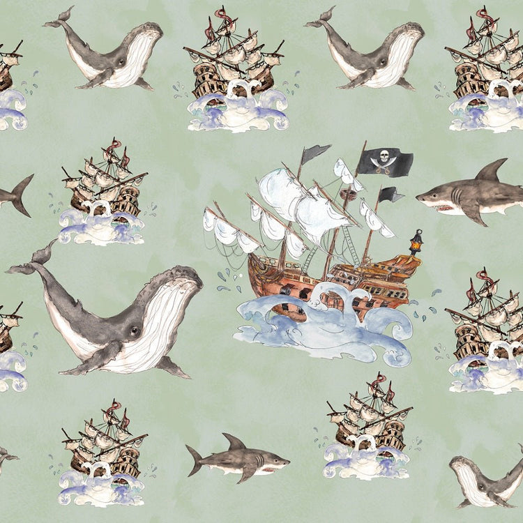 The Antique Green Pirate Adventure Ship On the Sea Fabric is part of the Pirate Adventure Fabric Collection printed by Sew Creative Fabrics. Digitally Printed on 100% cotton.