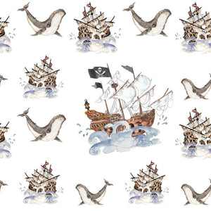 The White Pirate Adventure Ship On the Sea Fabric is part of the Pirate Adventure Fabric Collection printed by Sew Creative Fabrics. Digitally Printed on 100% cotton.