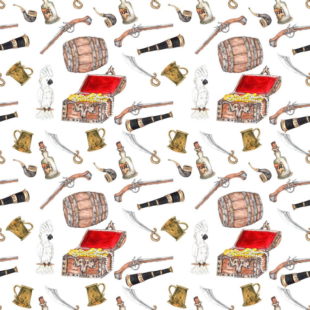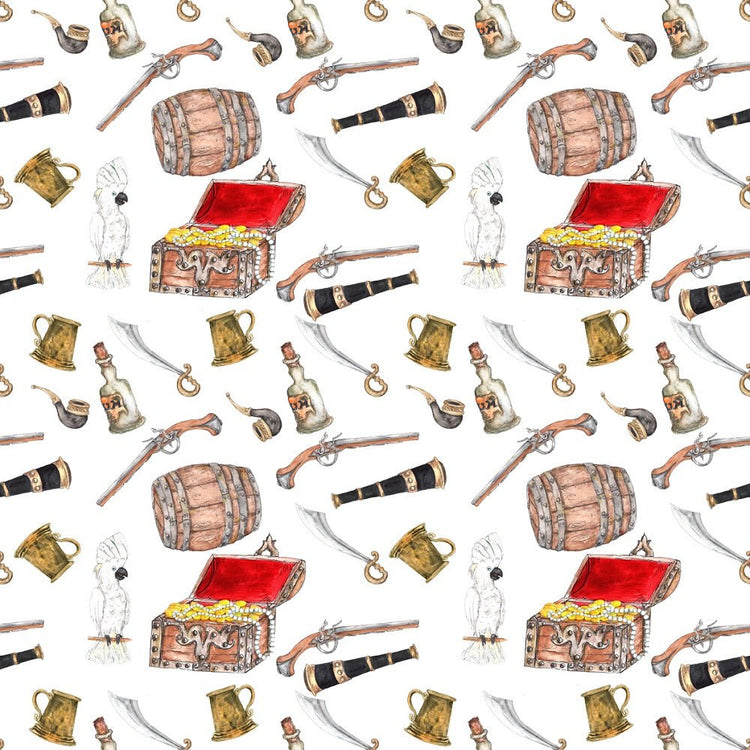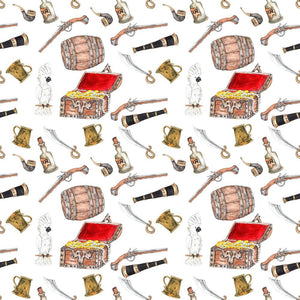 The White Pirate Adventure Treasure Fabric is part of the Pirate Adventure Fabric Collection printed by Sew Creative Fabrics. Digitally Printed on 100% cotton.