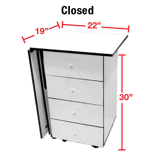 This Portable Sewing Table is perfect for those with limited space. It can fold into a 19" x 22" space with four easy glide drawers (measuring 12" x 13" x 5") to keep your notions, patterns, and more in place. A height of 30" allows you to sit comfortably while you work. Sturdy, locking casters ensure easy mobility of the table when needed.