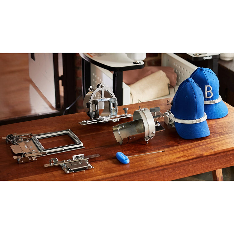 The Brother Sports Kit, PRSPRTKIT1, is a comprehensive accessory package designed to elevate your embroidery capabilities, specifically tailored for sportswear and athletic apparel. This kit includes a variety of specialized frames and tools that make it easier to embroider on challenging sports garments like jerseys, caps, and other athletic gear. Whether customizing team uniforms, creating personalized sports merchandise, or producing professional-grade athletic designs, the PRSPRTKIT1 ensures precise, high-quality results. It's an essential addition for businesses or hobbyists looking to expand their embroidery services into the sportswear market. This kit includes the Flat Brim Cap Set and the M Clamp Frame.