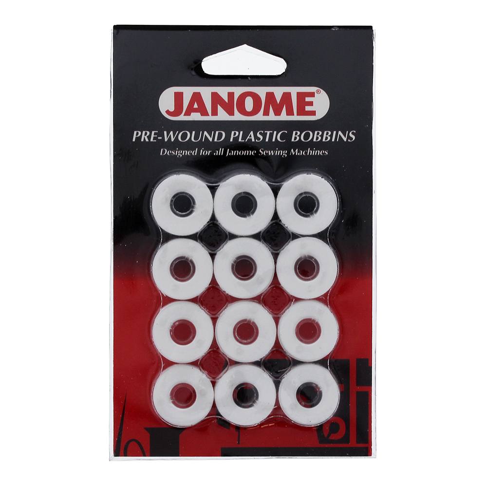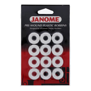 Pack of 12 genuine Janome, pre wound bobbins with white thread.