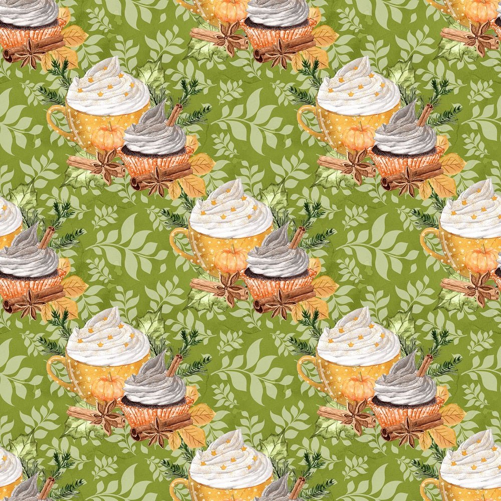 Pumpkin Spice Latte on Leaves Fabric - Green Details