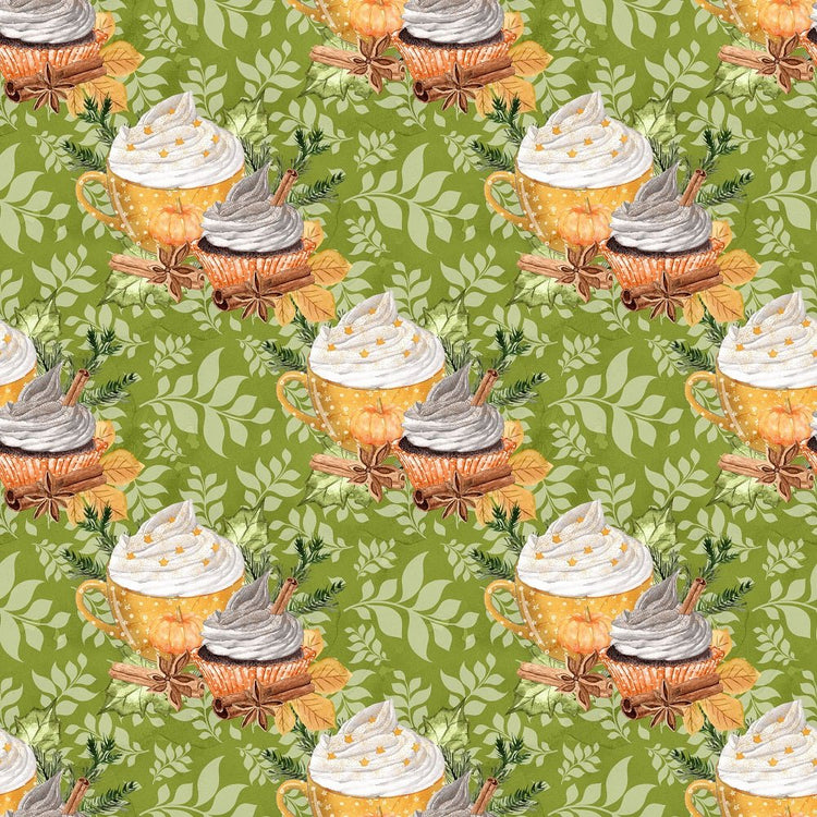 Pumpkin Spice Latte on Leaves Fabric - Green