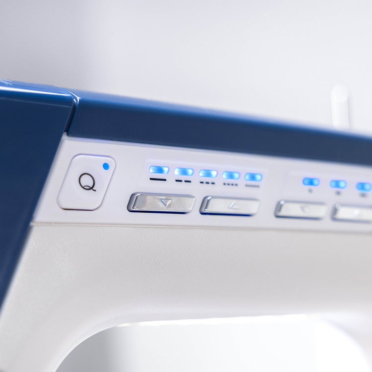At your fingertips are a variety of convenient buttons to help you. Enjoy the convenience of a start/stop button, a reverse button, and a programmable needle up/down button. Along the top of the machine, you can adjust your stitch length from 6 to 18 stitches per inch or change your sewing speed. The "Q" button lets you turn the stitch regulator on or off for sewing or free-motion quilting.