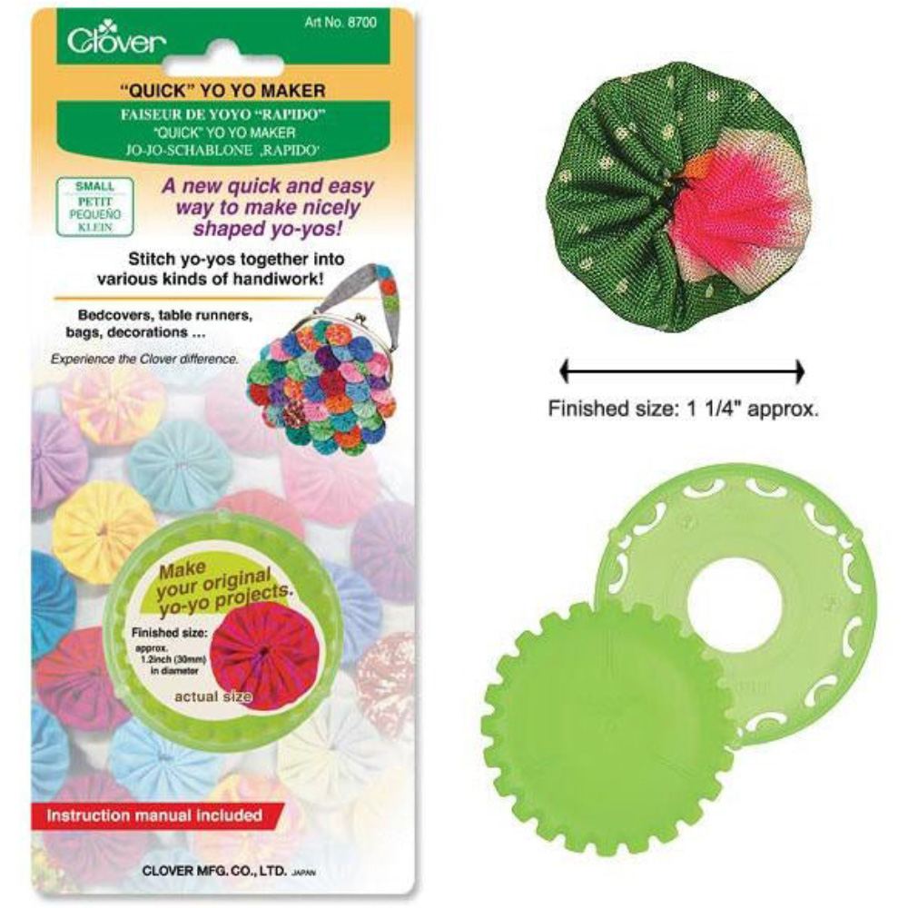 Clover's Quick Yo-Yo- Maker makes wonderful, hand-sewn fabric yo-yo's with ease! Use suitable fabrics such as soft fabrics with draping properties (sheetings, broadcloths) along with strong hand sewing thread/quilting thread. The finished size is approximately 1.2" (30mm).