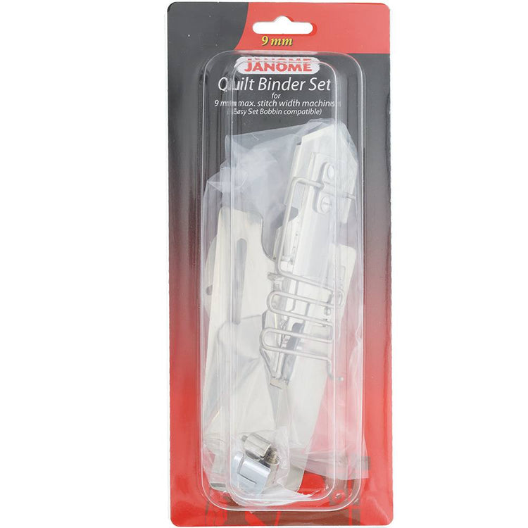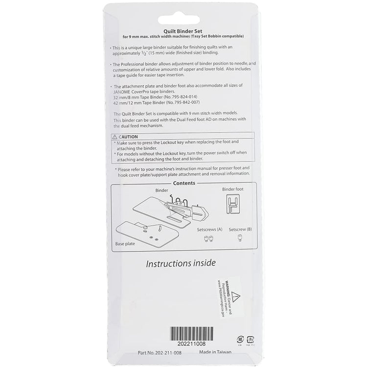 The Quilt Binder Set is the perfect accessory for quick and trouble-free binding, with a superior design based on industrial binding attachments. The cone on the front of the fabric holder feeds and folds fabric for a ½" finished binding. Two upper screws on the binding allow you to adjust the fold of the fabric - set them at the same length for a straight stitch or set the bottom a bit further than the top for a blanket stitch.