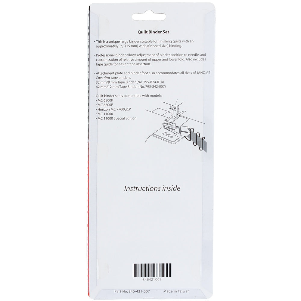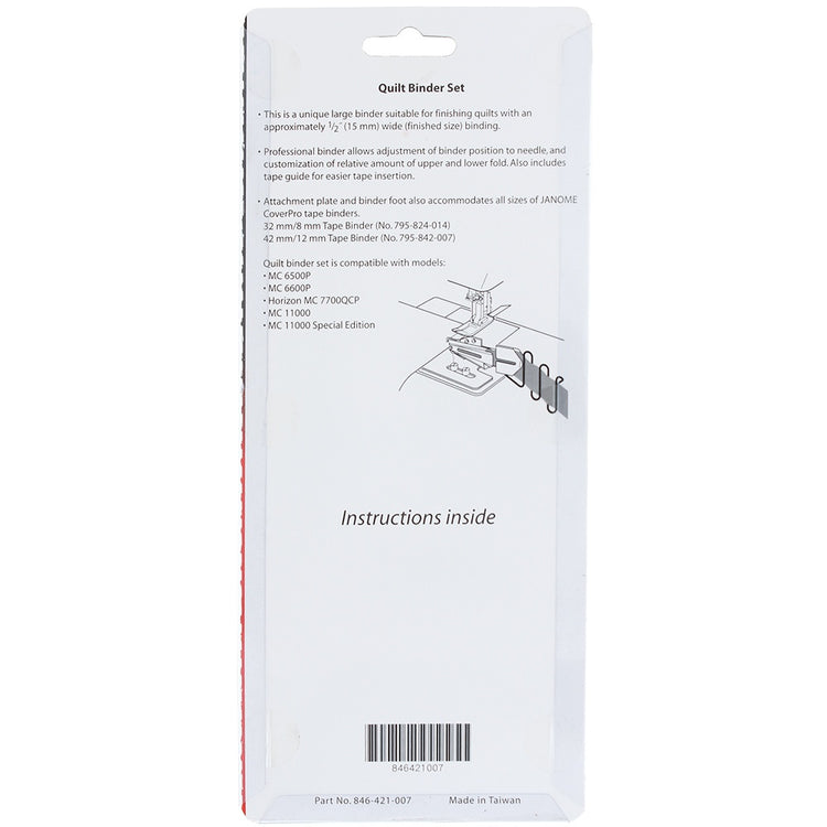 The Quilt Binder Set is the perfect accessory for quick and trouble-free binding, with a superior design based on industrial binding attachments. The cone on the front of the fabric holder feeds and folds fabric for a ½" finished binding. Two upper screws on the binding allow you to adjust the fold of the fabric - set them at the same length for a straight stitch, or set the bottom a bit further than the top for a blanket stitch.
