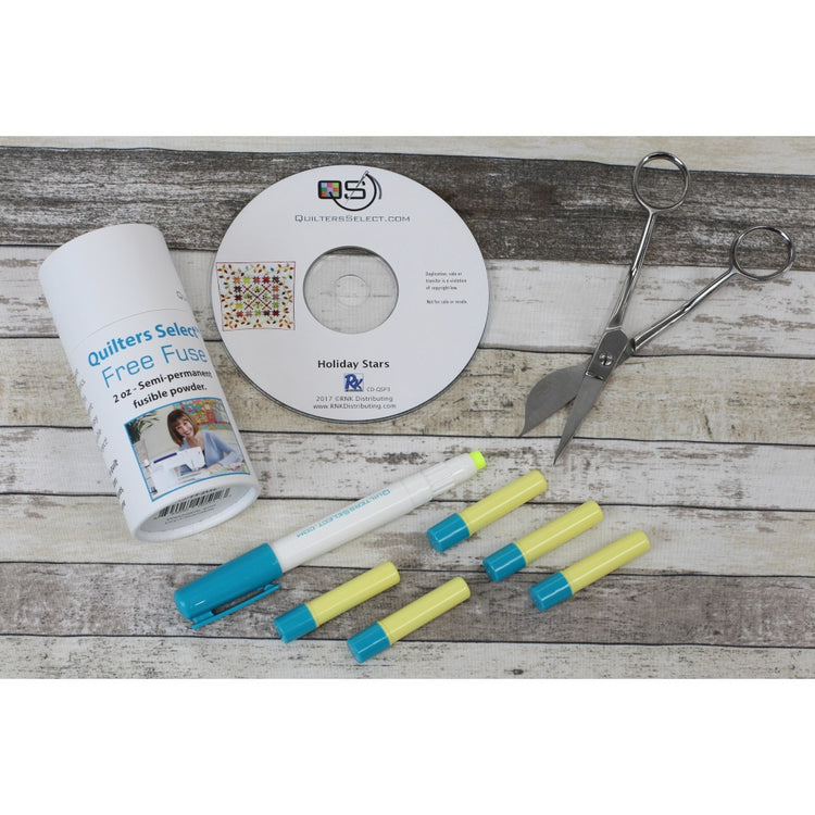 Quilters Select has assembled a Holiday Stocking Stuffer Bundle that is only available for a limited time. The bundle includes a Holiday Stars Quilt Pattern on CD, along with some essential tools for completing the project. The Holiday Stocking Stuffer Bundle also includes a pair of Wave Applique Scissors, 2oz of Free Fuse Semi-Permanent Fusible Powder in a convenient dispenser, and a fabric glue stick with five refills. This package makes the perfect gift for sewists this Christmas.