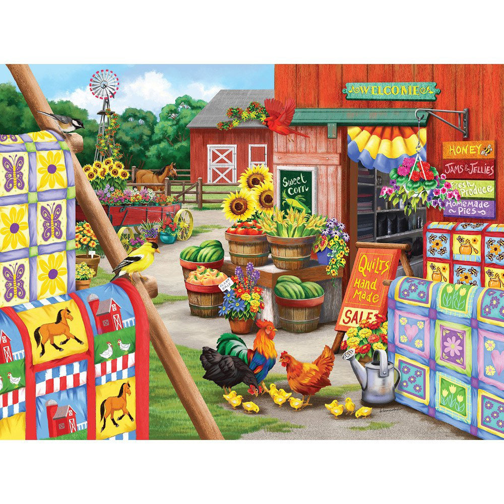 Enjoy hours of fun assembling the Quilts Jigsaw Puzzle from SunsOut. This highly detailed image features a variety of quilts displayed on quilt racks throughout a farm. Complete the Quilts Puzzle and proudly display it in your sewing room!