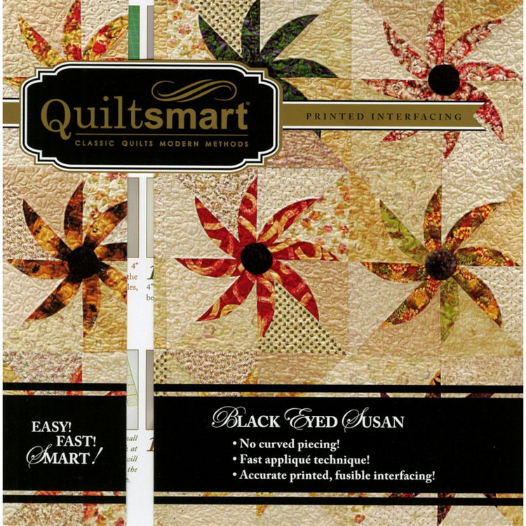 Quiltsmart's Black Eyed Susan Pattern Pack makes either a wall hanging or a lap quilt. The pattern includes four fusible panels with the pattern printed directly on them. Simply stitch, trim, turn, and fuse then applique your flowers onto your block. No curved piecing or needle turning required. The wall hanging finishes to 46in square and the lap quilt finishes to 53in x 67in.