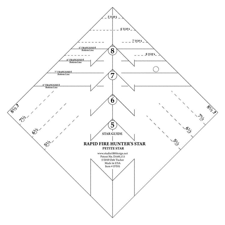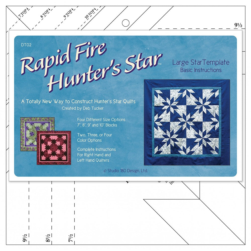 Deb Tucker's Rapid Fire Hunter's Star tool and technique allow for streamlined construction and precision trim down, resulting in ease and accuracy when making these traditionally difficult blocks. These tools include step-by-step illustrated instructions, charts for future projects, and a "basic recipe" to get quilters started on their first set of 16 blocks. The petite ruler measures 8-1/2" square while the large one is 10-1/2" square. Both of these tools have four block size options. The petite blocks measure 5", 6", 7", and 8", while the large blocks finish to 7", 8", 9", and 10". Tucker's Rapid Fire Hunter's Star Ruler is a must-have tool if a Hunter's Star pattern is on your quilting list!